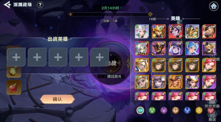 [深渊战场]1.深渊战场每层均有多位怪物驻守,需要逐层击破前往深处,直至通关深渊2.深渊战场每4天进行重置,分为2天挑战期,2天休息期。挑战期可潜入深渊,挑战怪物。3.层数越高则获取的奖励越丰厚,冒险者还可通过关卡掉落的深渊药水来调整英雄状态。4.战场开启后,冒险者至少选择1位英雄进入深渊,最多可选择5位英雄。确认英雄选择后本次深渊战场无法更换。5.深渊中,每层战斗的英雄继承血量与怒气,