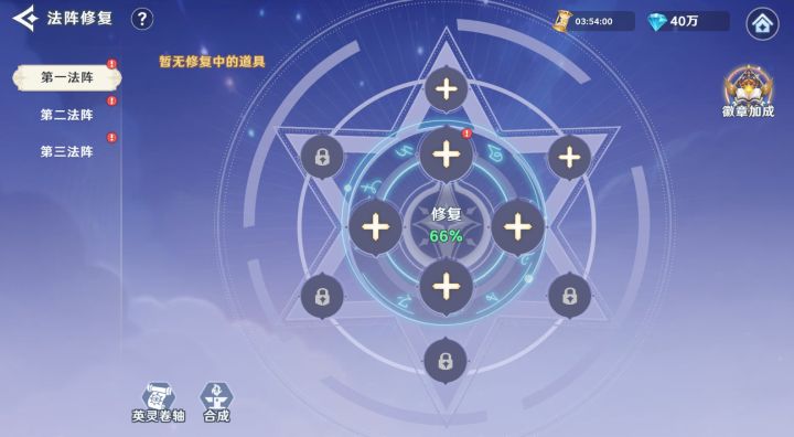 [修复规则]1.将修复道具放入法阵中可对残破的法阵进行修复。2.修复道具的品阶越高,修复的时间越长,法阵修复的进度越多,同时修复完成后获得的奖励越丰富。3.当法阵修复完成后,将会召唤英灵触发回忆事件。多次触发回忆事件后,更有概率触发特殊事件。4.可使用时光沙漏加速法阵修复#攻略 #发现好游戏