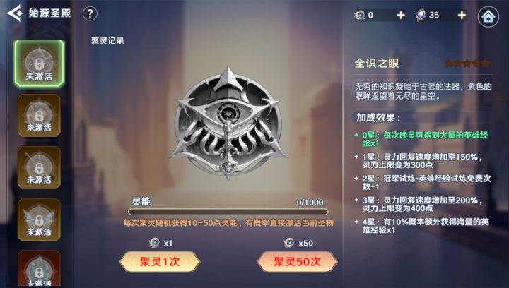 1、您可使用[聚灵星仪]对圣物进行聚灵召唤。聚灵时可获得灵能,当灵能值满后即可激活当前圣物。在聚灵时有概率(约0.15%)可直接激活当前圣物。2、激活圣物后,可使用[缀光星晶]对圣物进行升星,每升1星可激活一条圣物携带的属性。3、圣物激活后,每隔一段时间圣物将自行恢复一定的灵力值。在圣物界面每消耗100点灵力值即可进行1次圣物唤灵。唤灵后即可获得稀有道具,不同圣物可获得的道具均不同。圣物的星级