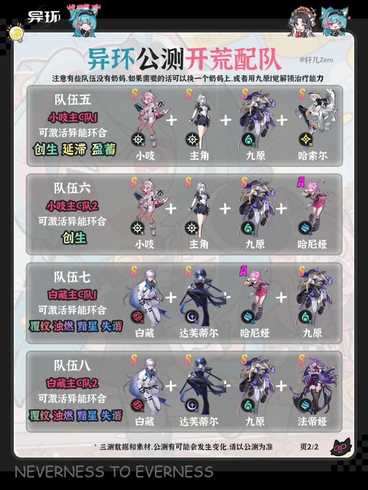 异环配队推荐,适用于游戏初期只有娜娜莉一个限定的开服版本,建议常驻自选拿九原/早雾优先级更高,三测数据仅供参考,以公测后调整情况为主———•✦•———⭐ 主C娜娜莉当前最佳配队是主角+九原+早雾,都是0觉的话没有治疗,建议九原1觉。如果没有早雾/生存压力大,可以换成阿德勒加盾。刚进游戏没抽到娜娜莉/九原,可以先用薄荷代替。⭐ 小吱可以通过玩法免费领取,小吱主C也可搭配主角+九原,剩余位置可带