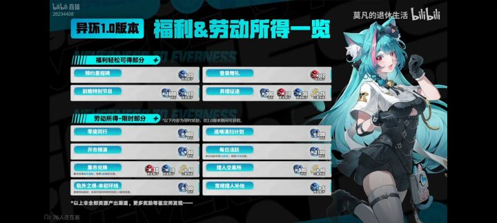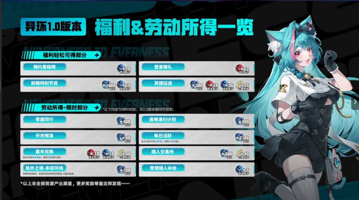 异环V1.0(公测版本)环石资源统计(抽数统计)———•✦•———⭐ 根据官方发布福利统计整理,部分1.0版本的奖励未统计,后续版本会根据游戏内容进行更为细致的统计⭐ 异环人物和角色升级突破都会获得一些奖励,这里按照最多情况统计,如培养角色较少预计会少一点⭐ 常驻一次性奖励只在1.0统计,后续版本将不再统计⭐ 后续版本会视情况进行上下半资源分开统计,便于鉴定师规划卡池⭐ 后面总数统计部