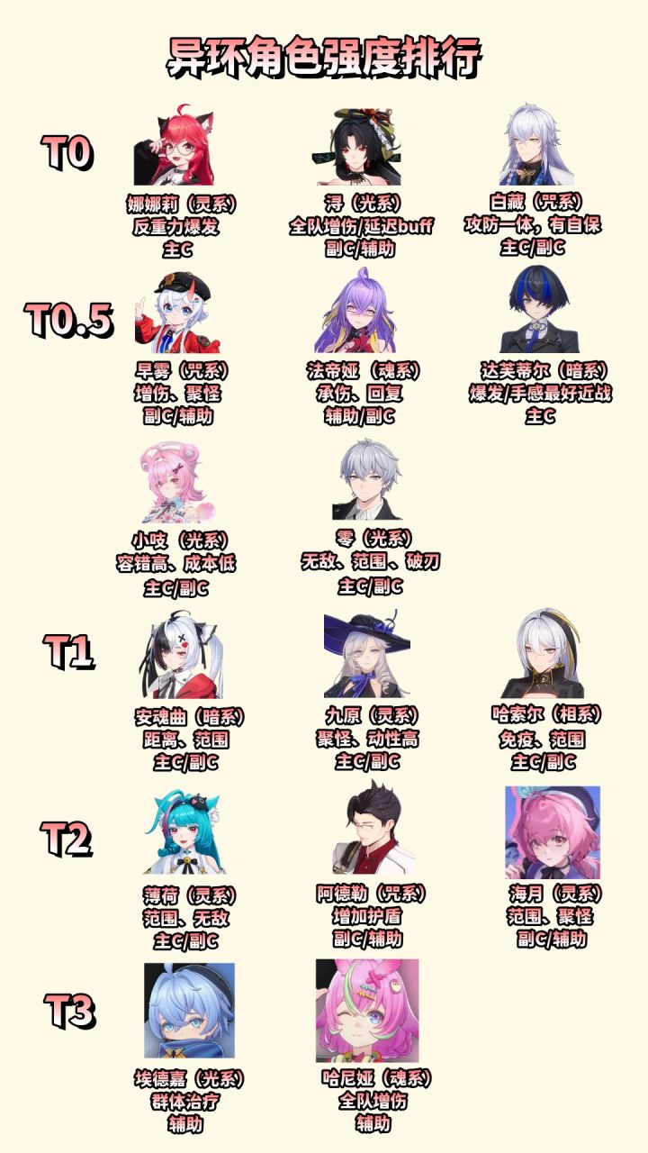 异环上测角色强度版 - T0:娜娜莉、小吱- T0.5:白藏、九原、早雾- T1:阿德勒、达芙蒂尔、主角、哈尼娅- T2:法帝娅、薄荷- T3:埃德嘉、鹏、哈索尔 二、元素系统核心规则 一、围绕T0主C的组队思路(结合强度+环合) 1. 围绕【娜娜莉(灵系·T0主C)】的队伍推荐 娜娜莉是灵系反重力爆发主C,优先触发灵系相关的高收益环合,同时搭配强度榜高的角色: - 核