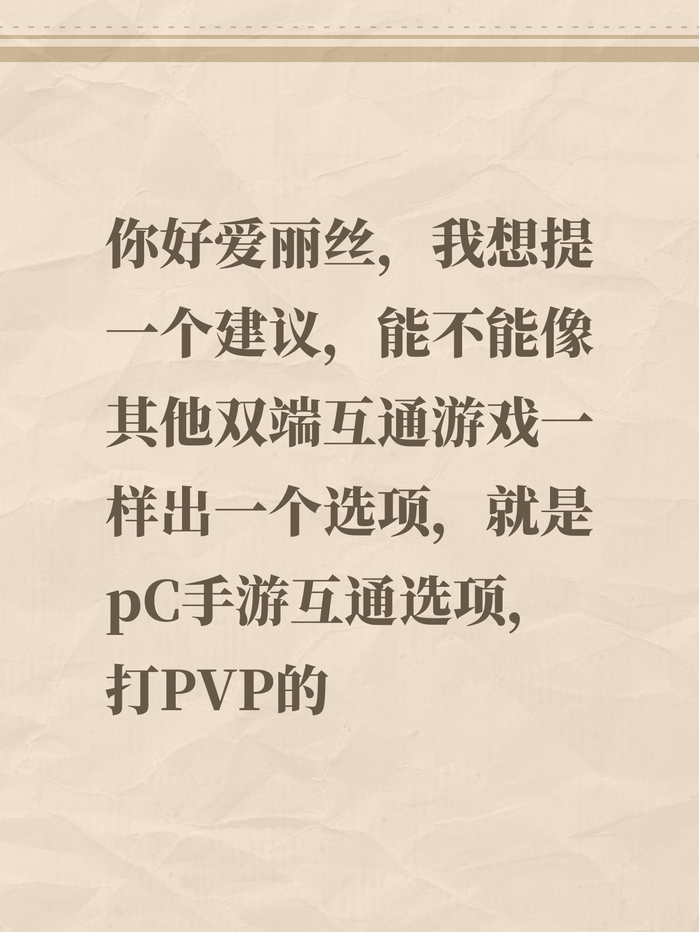 #超自然行动组四队对抗 你好爱丽丝,我想提一个建议,能不能像其他双端互通游戏一样出一个选项,就是pC手游互通选项,打PVP的时候pc端优势很明显,对于手游玩家极不友好,影响手游玩家体验,尤其是一些飞天喷子,pc端瞄准快,性能好,分辨率高,人物清晰,手游屏幕小,性能有限,卡顿等问题,希望出一个pc手游互通选项可以关闭pc手游互匹,以及达到匹配平衡。