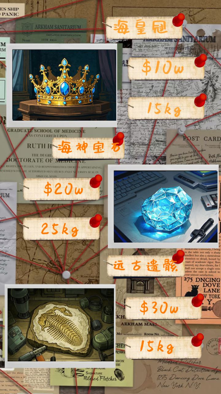 海底遗迹物品介绍银币:价值2q,2kg,白色品质。哪个倒霉蛋掉的钱?金币:价值3q,3kg,紫色品质。水手出海向海里丢入的金币,向海神祈祷保佑平安。硬币收纳袋:价值300,2kg,紫色品质,可收纳六个硬币。怕死鬼丢的钱袋。夜明珠:价值1.4w,25kg,紫色品质,是能源也是钥匙。黑暗中最亮的仔。敛息珠:价值1.8w,10kg,紫色品质,不能隐身但能收敛气息。感知系克星。海