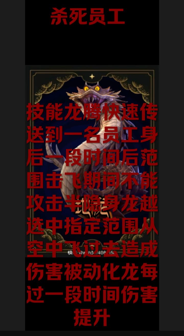 非对称竞技的2.0(之前投稿过) 一共10个玩家八名员工一名怪物一名伪人员工需要做任务且身上有一定金钱便会激活一道门所有员工做完任务且有一定金额(算总金额)便会激活大门获取龙珠需要一名玩家将龙珠带回车上或者杀死怪物伪人需要杀死怪物员工阻止员工带回龙珠怪物需要杀死员工(龙珠被取之后触发狂暴模式并启动透视眼)人类伪人可以打开箱子拾取道具合成装备 怪物有两个技能一个普攻(怪物自带) 员
