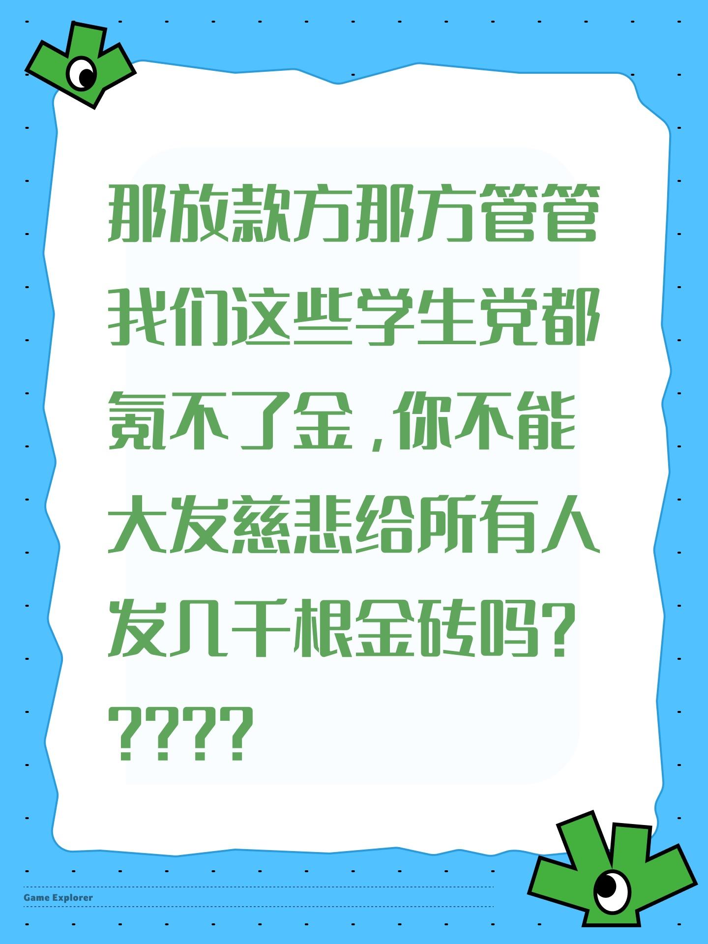 那放款方那方管管我们这些学生党都氪不了金,你不能大发慈悲给所有人发几千根金砖吗?????
