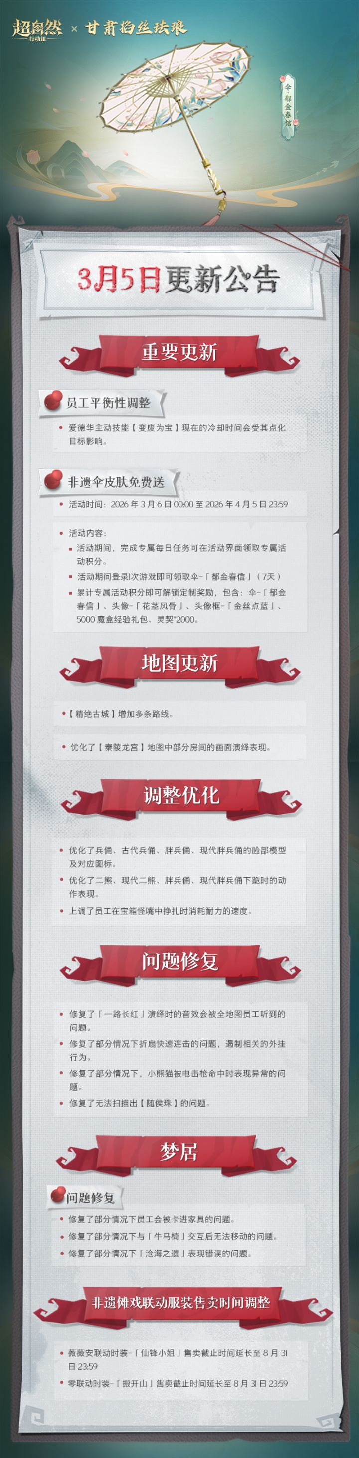 3月5日更新——非遗联动伞皮肤登录免费送!爱德华技能加强上线!