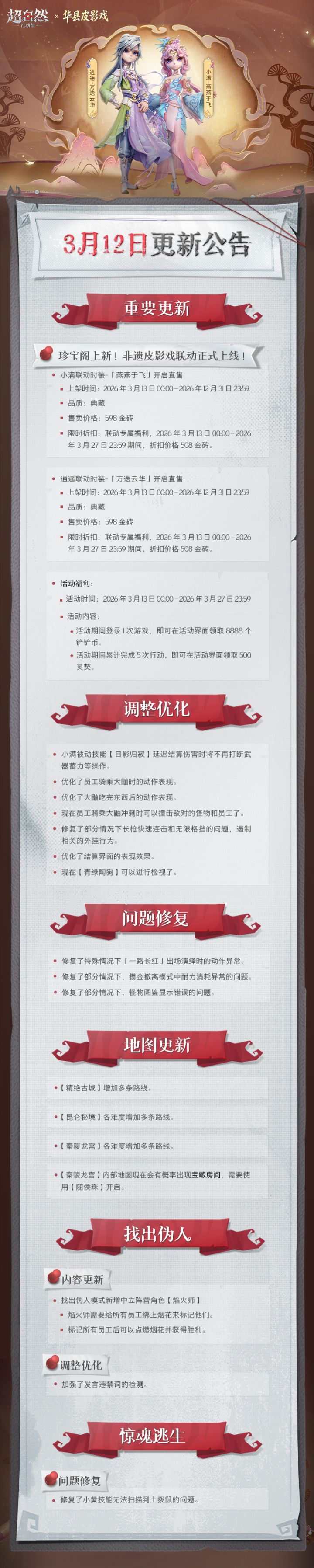 非遗联动皮影戏联动即将正式上线珍宝阁!3月13日0点记得来看,首两周还有专属福利折扣~【秦陵龙宫】新增宝藏房间啦,记得拿上【随侯珠】哦【找出伪人】模式新增中立角色【焰火师】,快来体验吧超多更新一图速览——