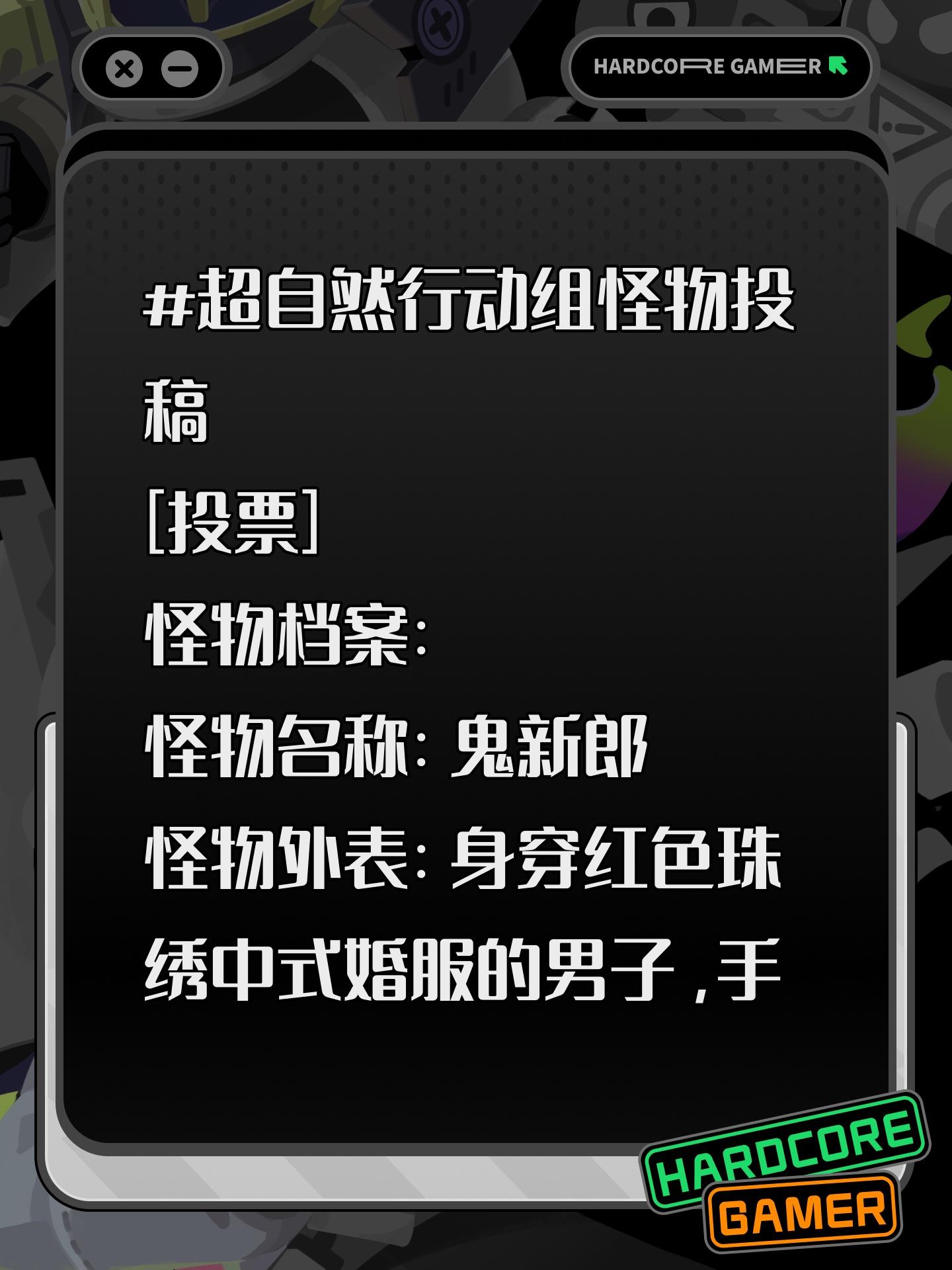 #超自然行动组怪物投稿 [投票]怪物档案: 怪物名称:鬼新郎 怪物外表:身穿红色珠绣中式婚服的男子,手持金扇,扇面绣有金龙图案,头戴金冠 怪物简介:会刷新在精绝古城和古蜀遗迹以及昆仑秘境的婚房内的灵异系怪物,当员工靠近婚房内的红色蜡烛时,鬼新郎便会刷新,刷新时伴随着男子的笑声和一阵唢呐声和蜡烛燃烧的声音,同时婚房内的火焰就会熄灭,刷新时,和鬼新娘一样,只有被锁定的员工才能看见,也会在闪烁