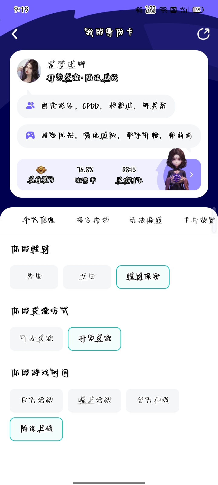 🆔迟矜(jin,矜持的矜)高中生,社牛,微氪党,话痨,很主动每天晚上23:00-2:00在线,月假全天在线df4固排或者靠山,不卡1V1,可以拉我一起玩就行,长期的不要体验卡,可绑关系,可v麦q麦会解电卡音响卡龙珠,会除雾小抄,摸金会昆仑古城,古蜀不太会,不会双队,微青年跑刀,幼年飞天,四队瘾比较大可以陪你玩第五,王者,逆水寒,光遇,没玩过的我也会下载去玩