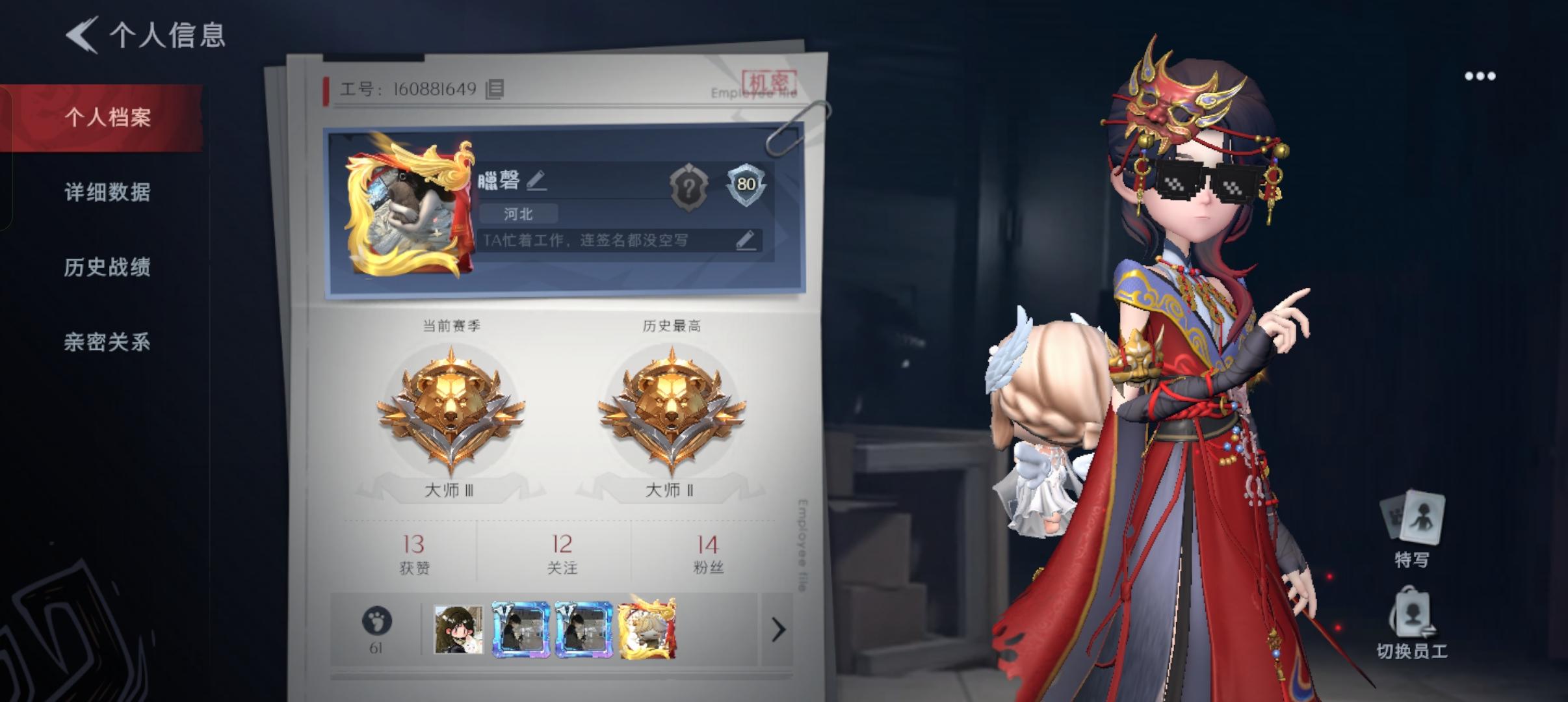 怀玉 【主动技能】 化形·千面戏法 (冷却150秒;提前结束则冷却减至120秒,持续时间15秒) 形态1:员工化形:变身为另一名队友所使用的员工,并可使用其技能。 形态2:怪物化形:变身为上一次亲手击杀的怪物,不会被其他怪物攻击,并可能拥有特定技能。(见下表)【被动技能1】 蛰伏伺机 静止站立2秒后,进入“气化”状态。怪物无法看见和触碰员工(会直接穿过),但员工仍会受到范围伤害或武器精准
