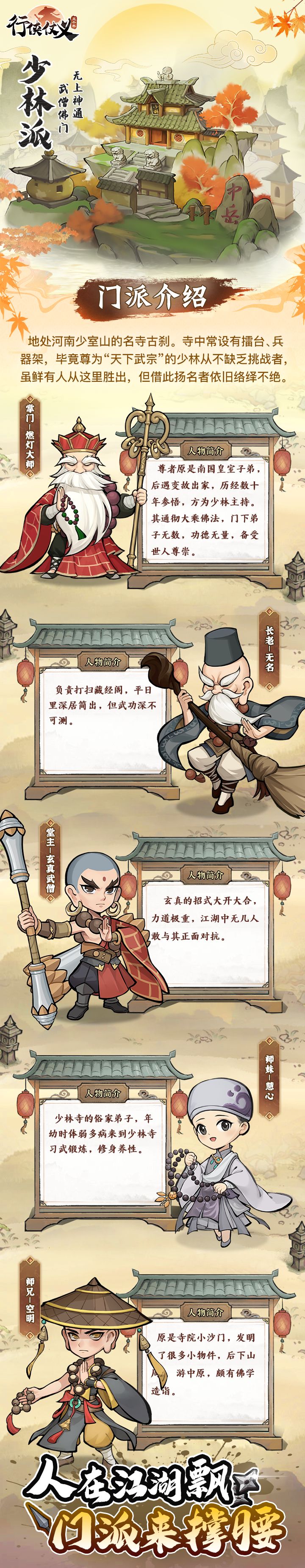 尊敬的各位大侠: 在《行侠仗义五千年》游戏中,加入门派,与掌门、同盟弟子交谈,并学习对应门派的心法都是很重要的。 在挑战完成当前的章节后才能开启新的门派选择加入,有些大侠可能也希望对其他门派保留一个基础的印象,或者对还未解锁的门派有一个提前的了解。 小侠也会为各位大侠做简单的门派图鉴哦!希望可以帮助大侠做基本的认知! 不记得门派中有何人物的时候可以随时翻看!