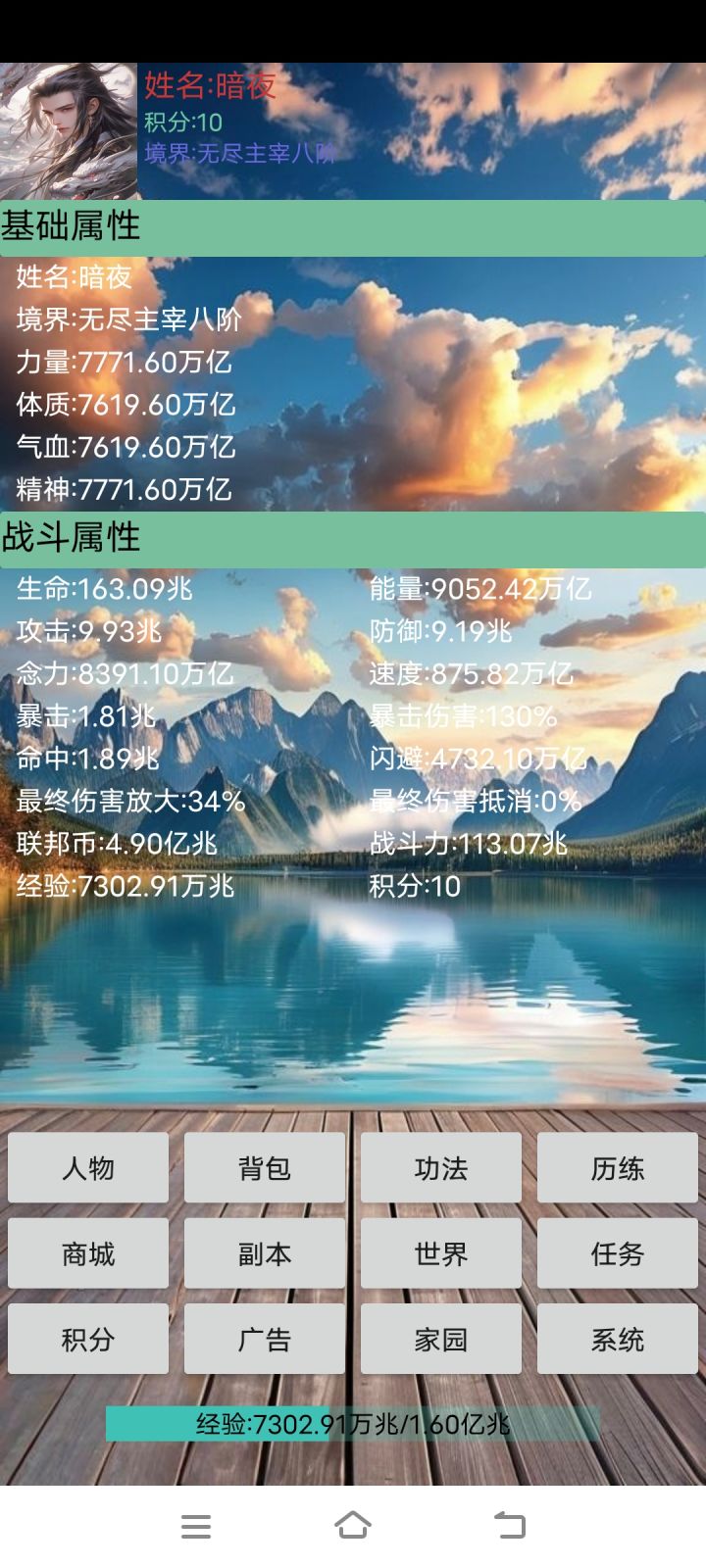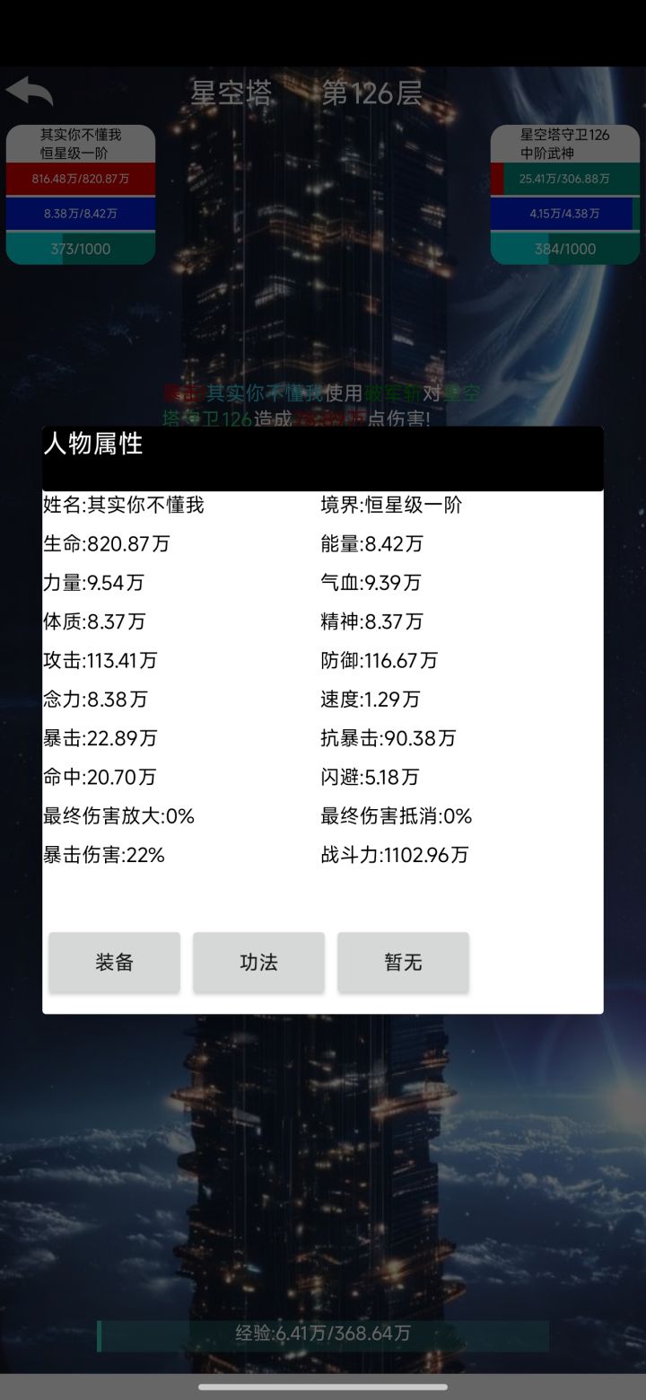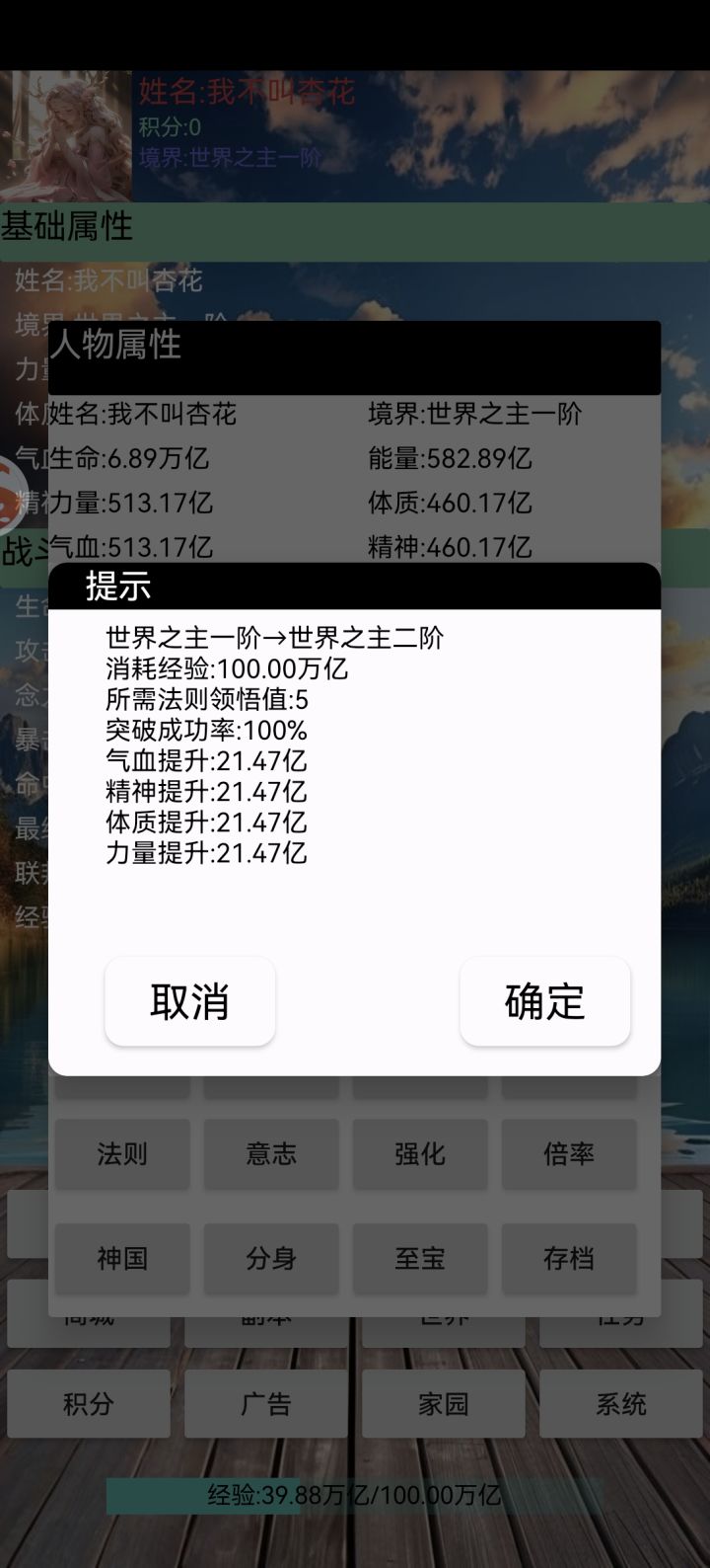 升级经验不够、意志升级也要一大笔钱,而且属性才加一点点。法则提升不动,强化要的强化石递增太快了。攒点钱想买五阶装备,发现还没副本掉的四阶装备好。现在唯一感觉进步稍微快一点的就是修炼功法加最终伤害。