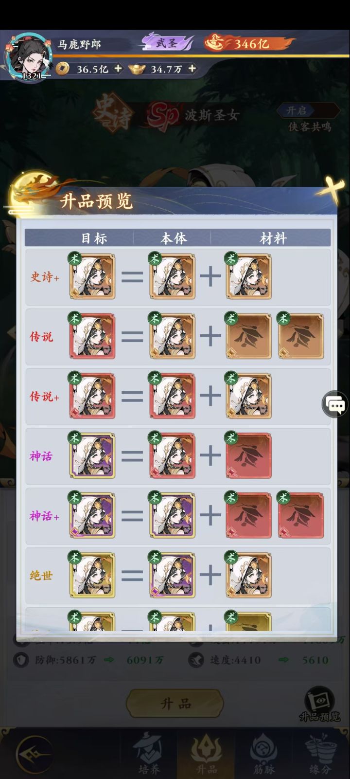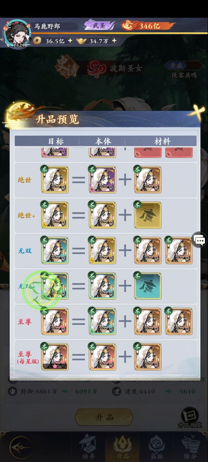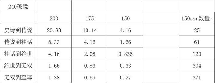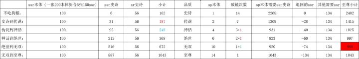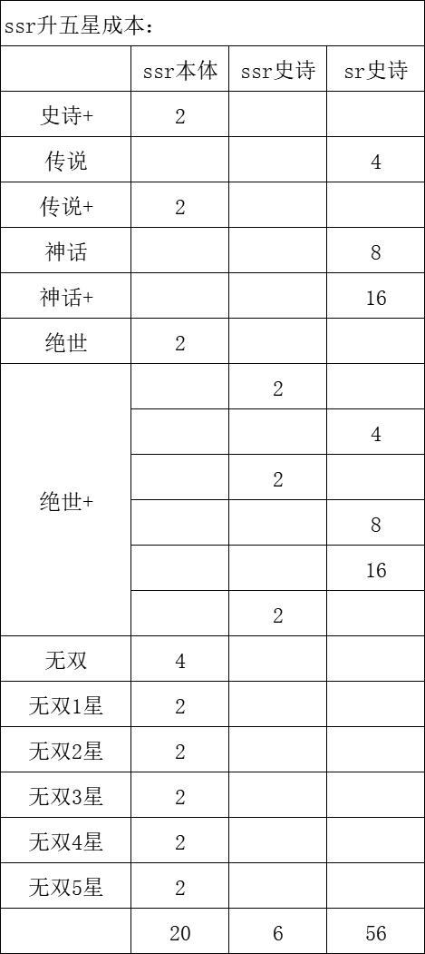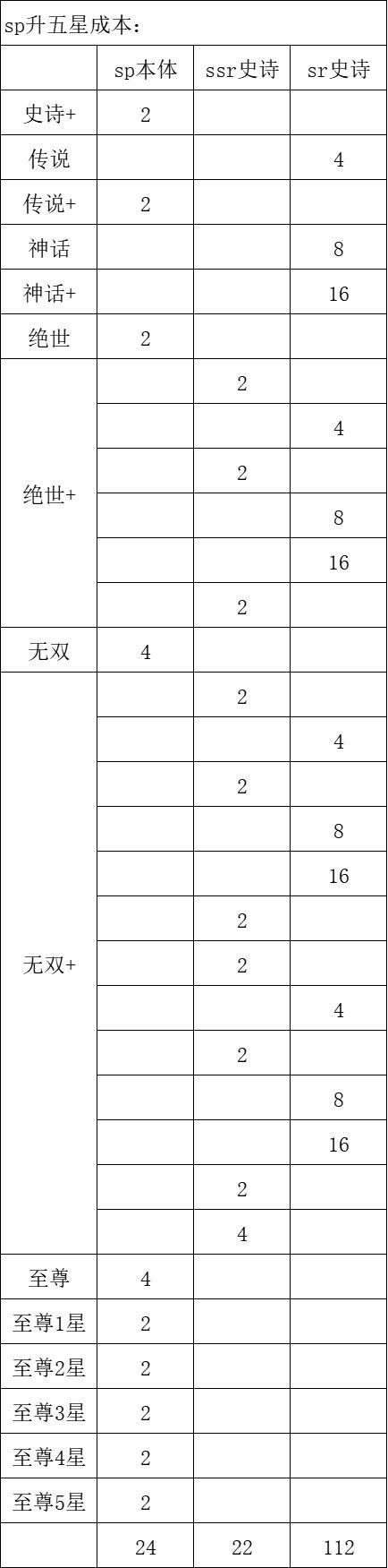 无双五星卡破镜可以到sp传说,sp卡可以继续一个轮回的升级,一直到至尊星级及以上,成本需要多少呢。31区刚玩40天玩家一个初步测算。首先是一个无双五星卡,成本是20张本体,6张其他SSR卡,56张SR的史诗卡(是SR史诗卡,9张SR合成的那种),破镜以后,如果不喂狗粮,变成一张SP史诗卡。然后一个SP至尊卡,成本是14张SP史诗卡,22张其他SSR,112张SR的史诗卡……也就是不喂狗粮,得破