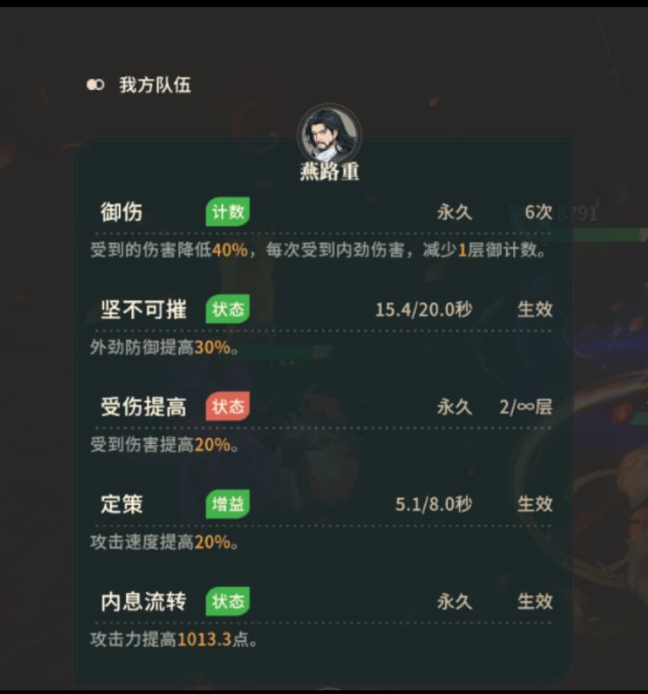 燕盾BUG,通脉三的描述为“御伤升级为强御,减伤系数+35%”,实测这条并未生效,请尽快修复,谢谢。截图燕盾状态第一张为释放自动技技后获得的御伤,第二张为释放绝技后获得的御伤,均未生效强御。