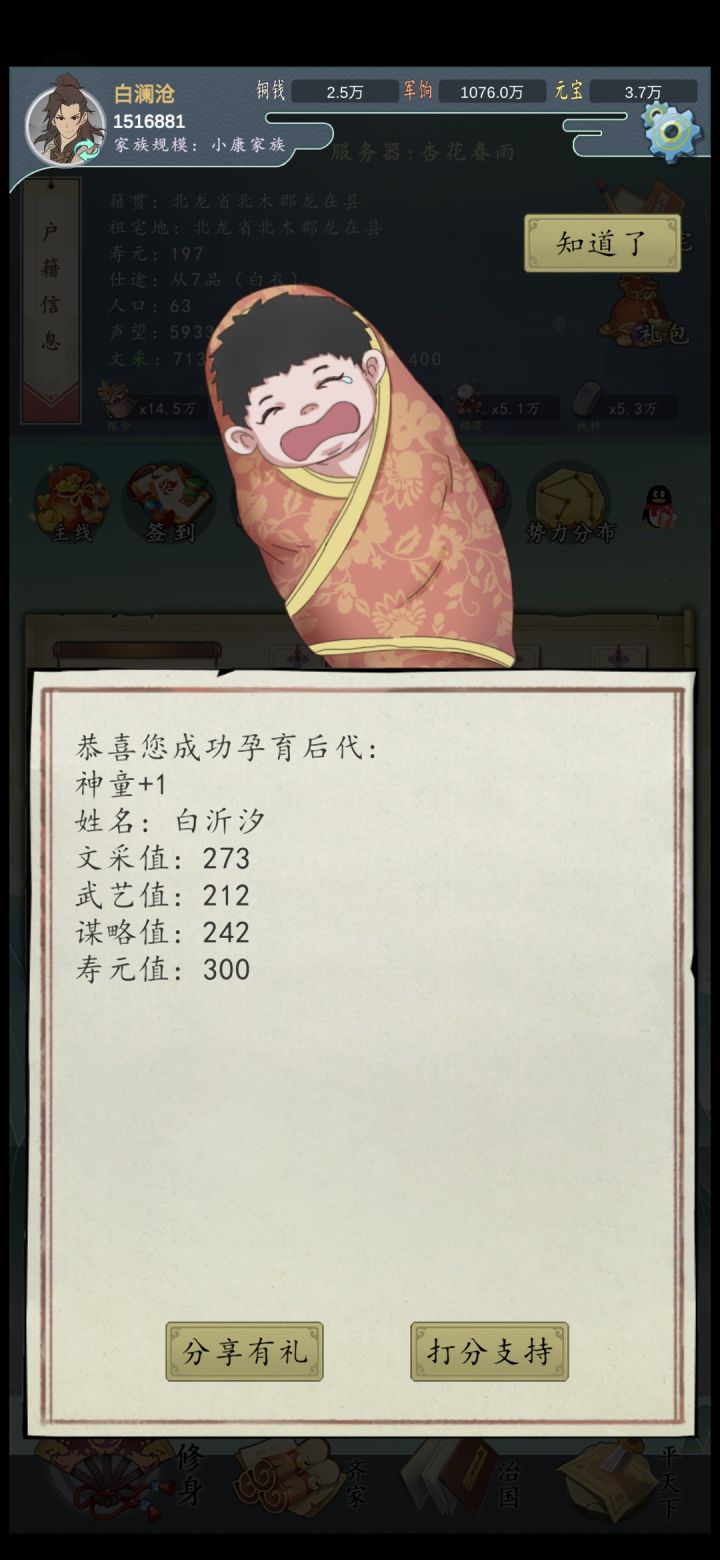 我家娃一出生就会算账,取名‘神算子’,家族财务终于有人接管了!我已经把账本交给他了,未来家族经济就靠他了!----白澜沧(1516881)恭喜您成功孕育后代:神童+1姓名:白沂汐文采值:273武艺值:212谋略值:242寿元值:300
