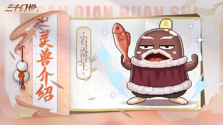 岩灵兽王,《我是大神仙》中强大的灵兽王之一。性情高傲,但能够将所见之物传到所有传影石上,为时江构建仙界购物平台提供了强大的助力。《三千幻世》中岩灵兽王附加了强大的技能,能够为复序者们的战斗提供强大的助力。岩灵兽王单体/控制●技能:鲜鱼击打岩灵兽王从胃袋取出鲜鱼击打敌方,对敌方生命最低的单体造成一定百分比伤害,并有一定概率对目标附加【眩晕】效果,持续1回合。岩灵兽王能够对敌方生命最低的单体