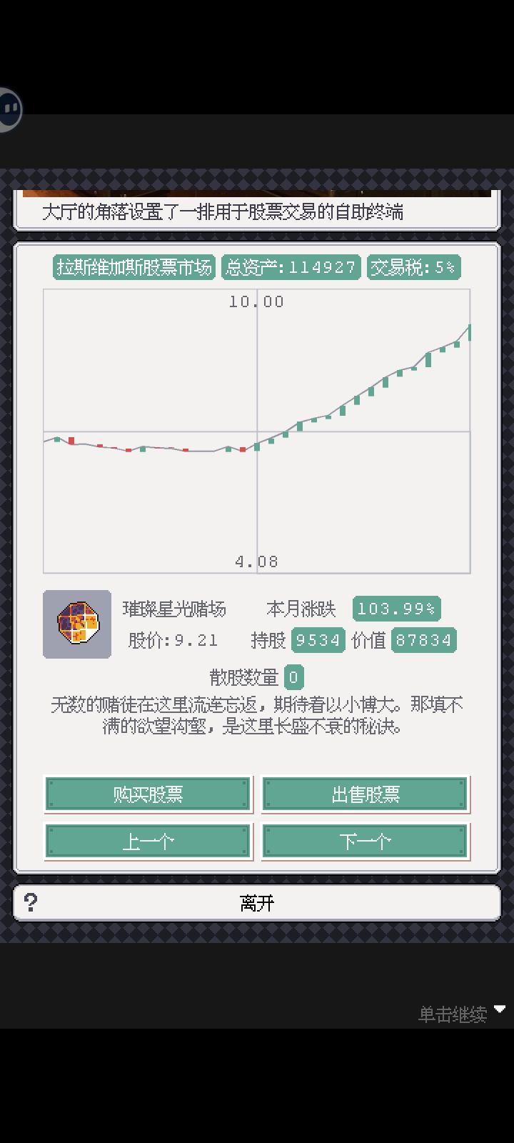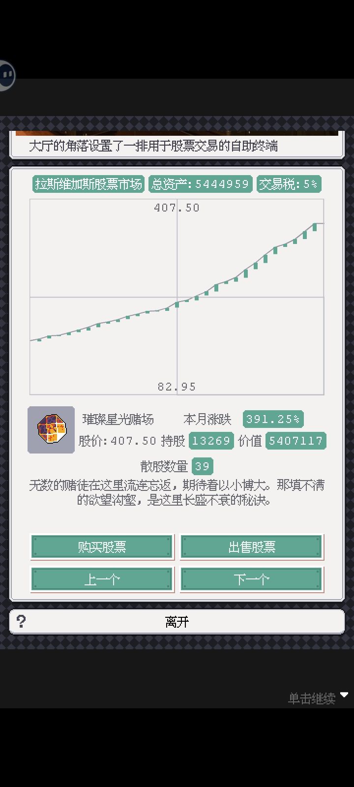 好像没人说炒股,我就写一下吧。在本游戏中,炒股即在股票交易自助终端中通过屯积散股,低买高卖来实现迅速富裕的技巧。当前版本可在旧金山-富人区-商会总部,拉斯维加斯-凯撒宫进行炒股。就我自己的档而言,股价最高的是璀璨星光赌场,4块钱一股,高的话可能有三四十左右一股。被东君削了之后炒股股价被限定在407.5一股,可以看封面图,最后两天是直线且无色,说明不能涨了。由此可以得到我们的目标,在股价最低
