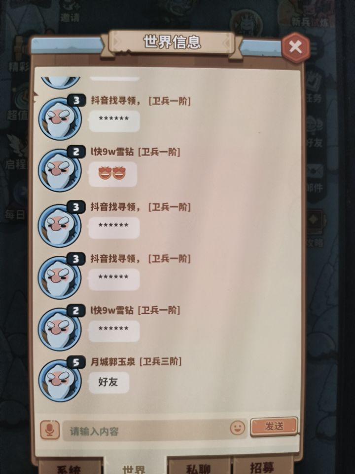 这两货一直在世界频道刷屏,官方检测不出来吗?世界频道还有啥意义,拿给他们打广告?该禁言的不禁言,我重复发个组队码或者邀请码都被禁言!你们就是这样看玩家的吗?还是说现在已经72服了,可以不管了?#快来当领主 #浅评一下