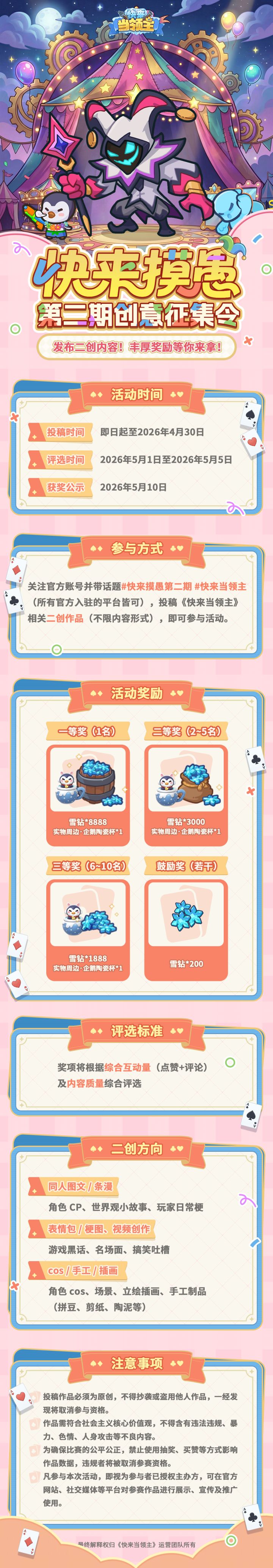 奇思妙想,脑洞大赏!第二届快来摸愚创意征集令来袭~同人图文、名场面创作、角色cos、手工作品均可投稿,肆意发挥你的创意,更有机会赢得雪钻*8888的大奖哦!#快来摸愚创意征集令 #快来当领主