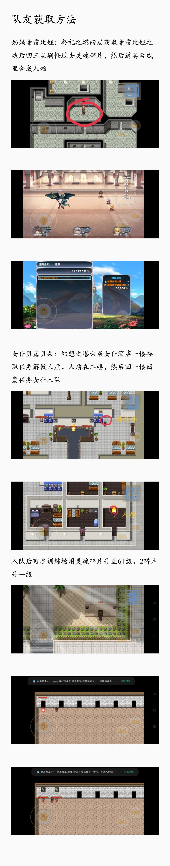 虚拟按键:双指点击屏幕打开菜单,点击游戏设置,点击打开或关闭虚拟按键战斗逃跑:战斗中按返或者双指点击屏幕可进入返回界面,然后选择逃跑 召唤器:用完卖掉或者放仓库,再次使用会重置角色。队伍换人:打开虚拟键盘,选择整队后键盘往右拉技能:后续召唤加入的队友在技能研究那有个天赋技能需要手动学习。复活:队友死亡可以通过触碰恢复水晶恢复或者使用帐篷(帐篷在道具店购买)神石:boss掉落,芭蕉洞小怪