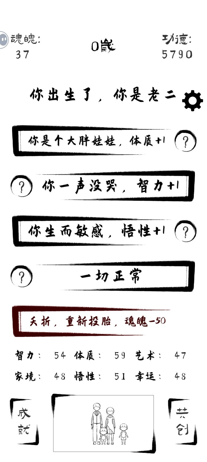 大家好,我是《投胎模拟器》的制作人时逆,这是篇精简版的游戏攻略。 要想玩好《投胎模拟器》,需要明白六大属性和魂魄功德的作用。也可以直接在成就界面查看各种成就的达成攻略,快速了解游戏内容。 功德越高,玩家投胎时的初始可用属性点数越高,玩起来就越爽。魂魄则类似倒计时,魂魄耗尽,游戏结束,功德归零,从头再来。所以玩好本游戏的核心就是用尽可能少的魂魄换取最多的功德,不断滚雪球。至于如何达成这个目的,就