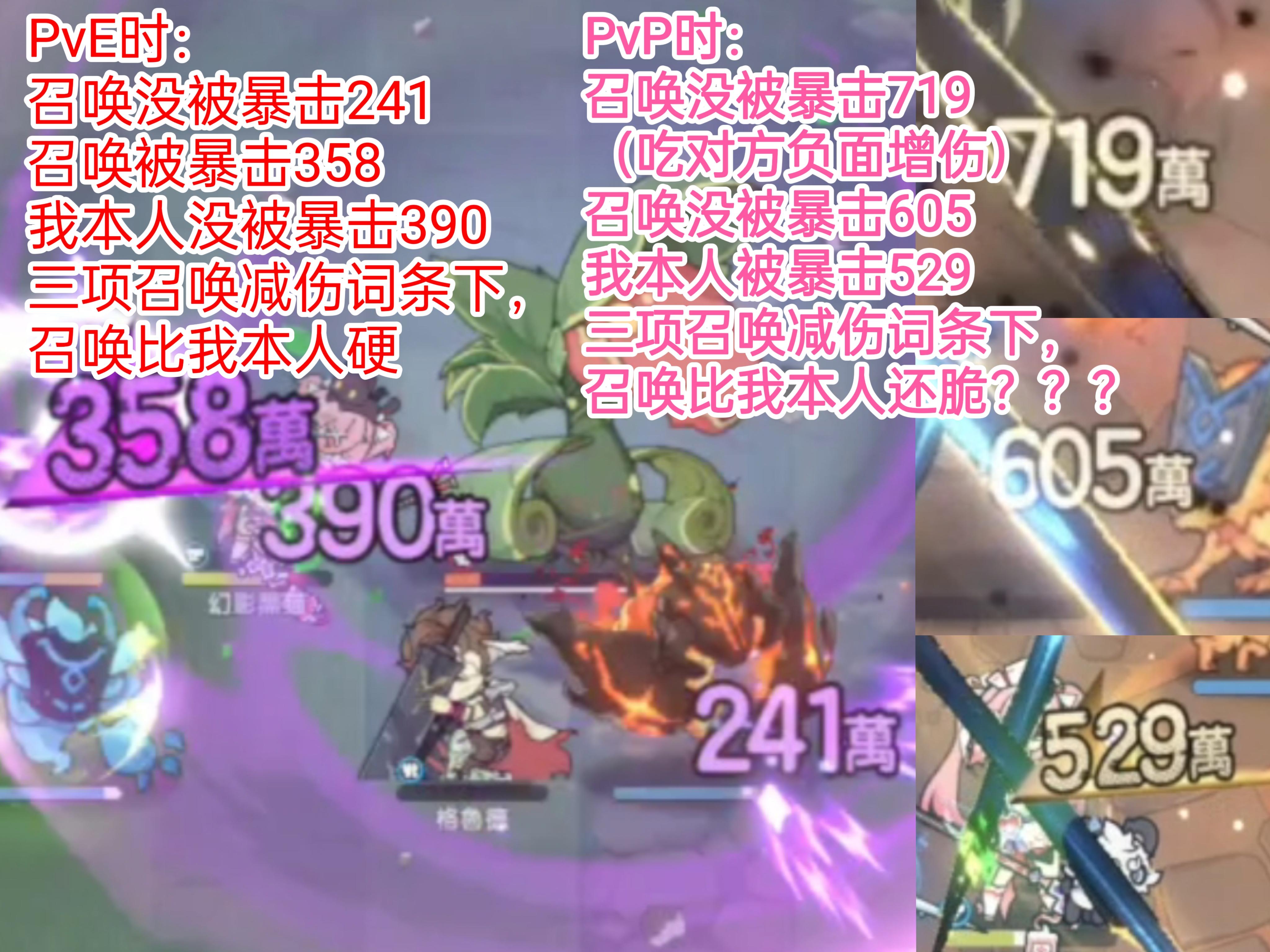 平衡之美?PvP召唤物被针对的问题https://www.taptap.cn/moment/750186956519902448之前发过了pvp承伤的问题,今天再补上一个pve承伤的图。在【三件召唤减伤】的词条下,怪同一个技能打我和两个召唤物,受伤由高至低分别是:1. 『没被暴击』的我本人390w2. 『被暴击』的召唤358w3. 『没被暴击』的召唤241w这就符合我期待的结果,要不