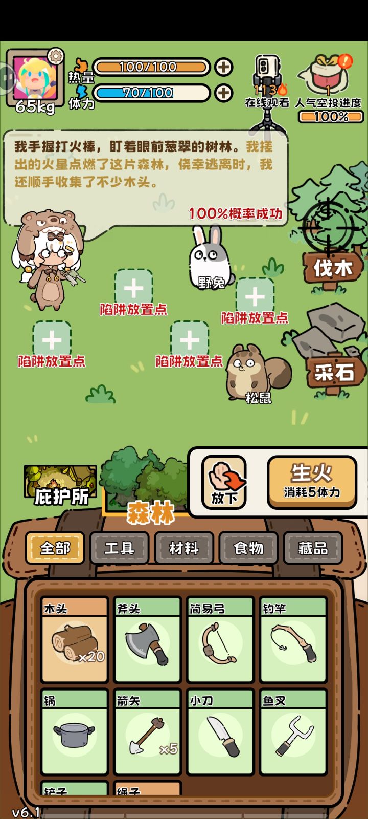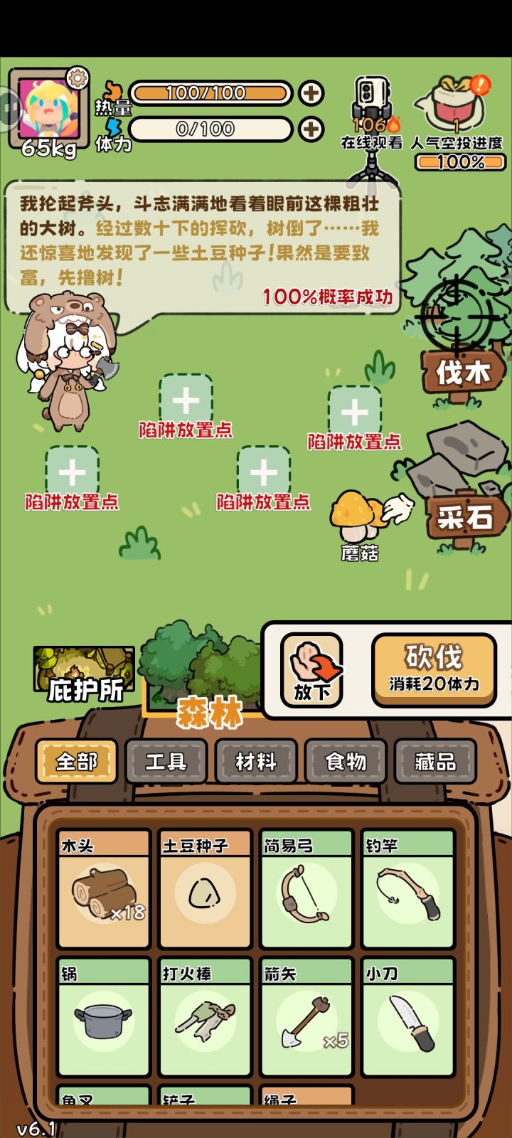 通用空投:羽绒服(热量消耗降低,约平时20冬天30➕)、幸运药水(提升成功率和命中)、能量饮料(2×50体,前期)通用路径:①苟:前期食物丰富时菜肉都拖到最后再做,烂前吃。遇熊/豹开熏肉。脂肪消耗约0.5热量差②v3.5熟鱼肉➕1,开局躺椅后走钓鱼更容易通关了③广告价值:27天左右热量广告(普通可续命2天➕,羽绒服可续命3天➕)>1天能量广告>熊豹时能量广告>其他④未成形:熊豹>>砍树>
