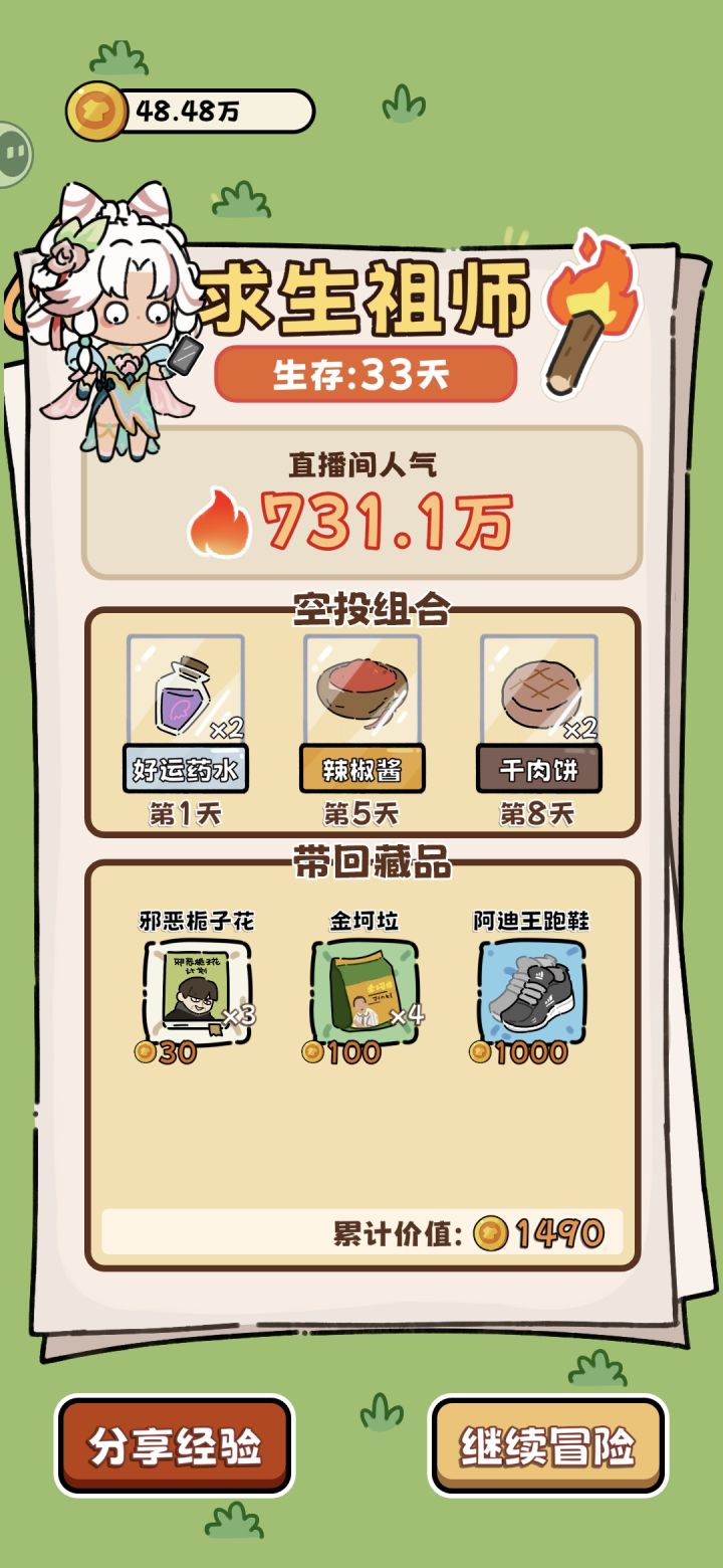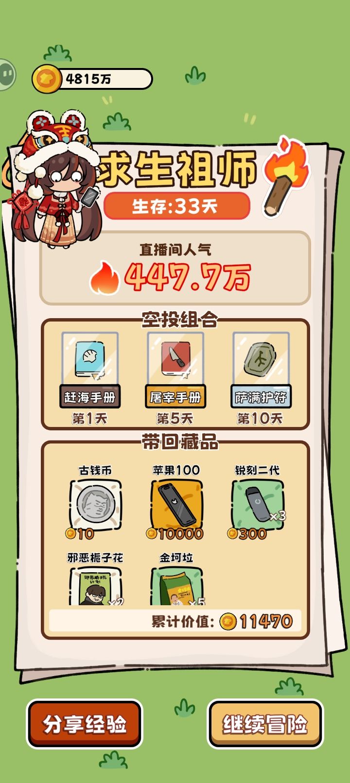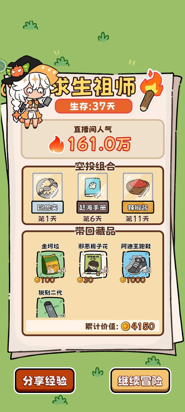 我自己玩了两天,按大佬的攻略走,很难,那个陨石很难刷,还有什么养蘑菇真的概率很小。每次刷空投看广告真的很烦。我自己攻略之路先开始我屏幕刷开始的空投,没刷出满意的就放火烧山重开,但是后面下雨了没成功,大家可以点头像下面有重开,适用于开局刷空投,我弄了两三次都没刷出陨石,第四次刷了个黄色的复合弓,打猎用很好用,后期刷出了一个手串提高概率的吧,开始就做陷阱3个,然后砍树(有几率掉种子),捡捡东西,有