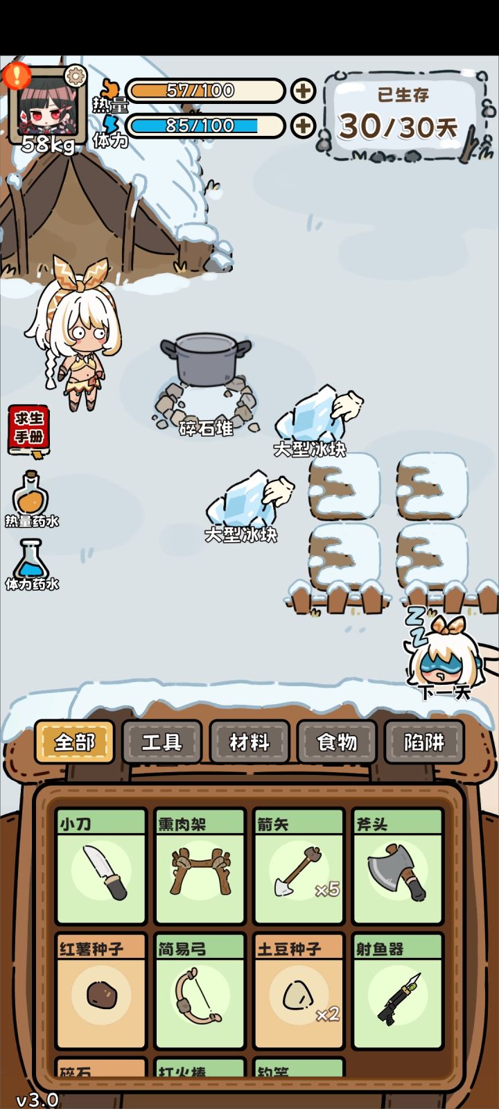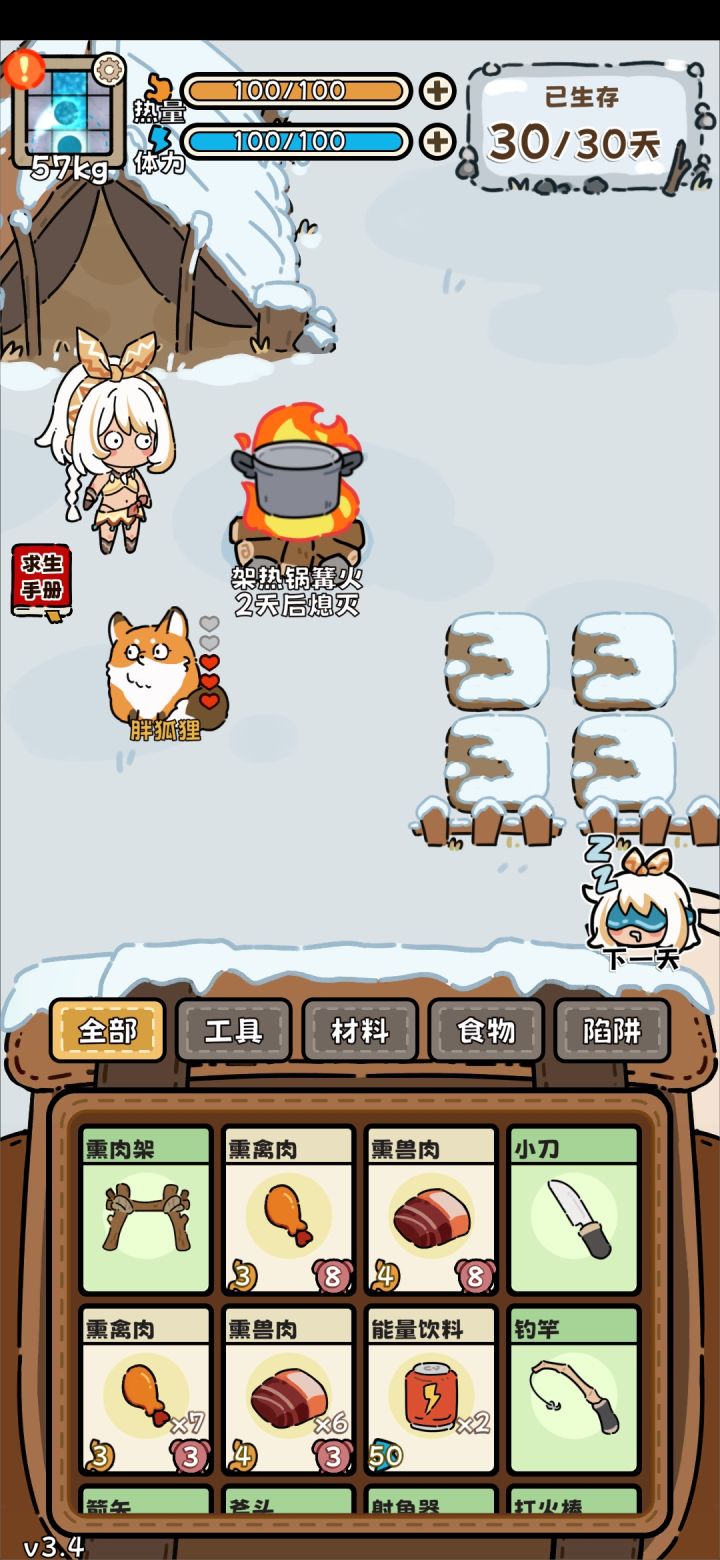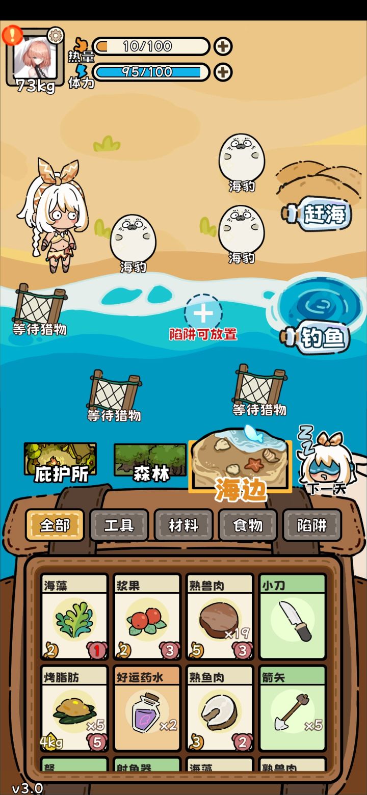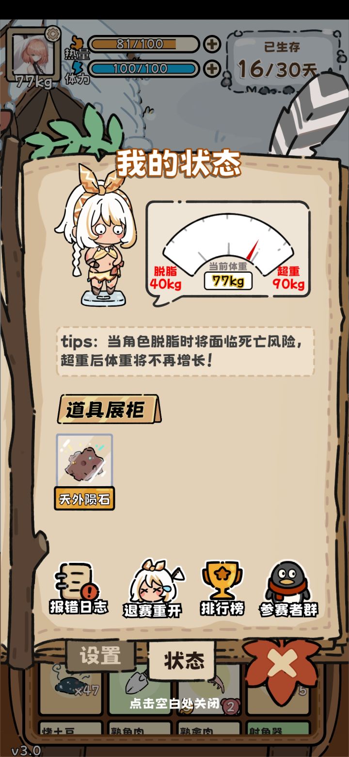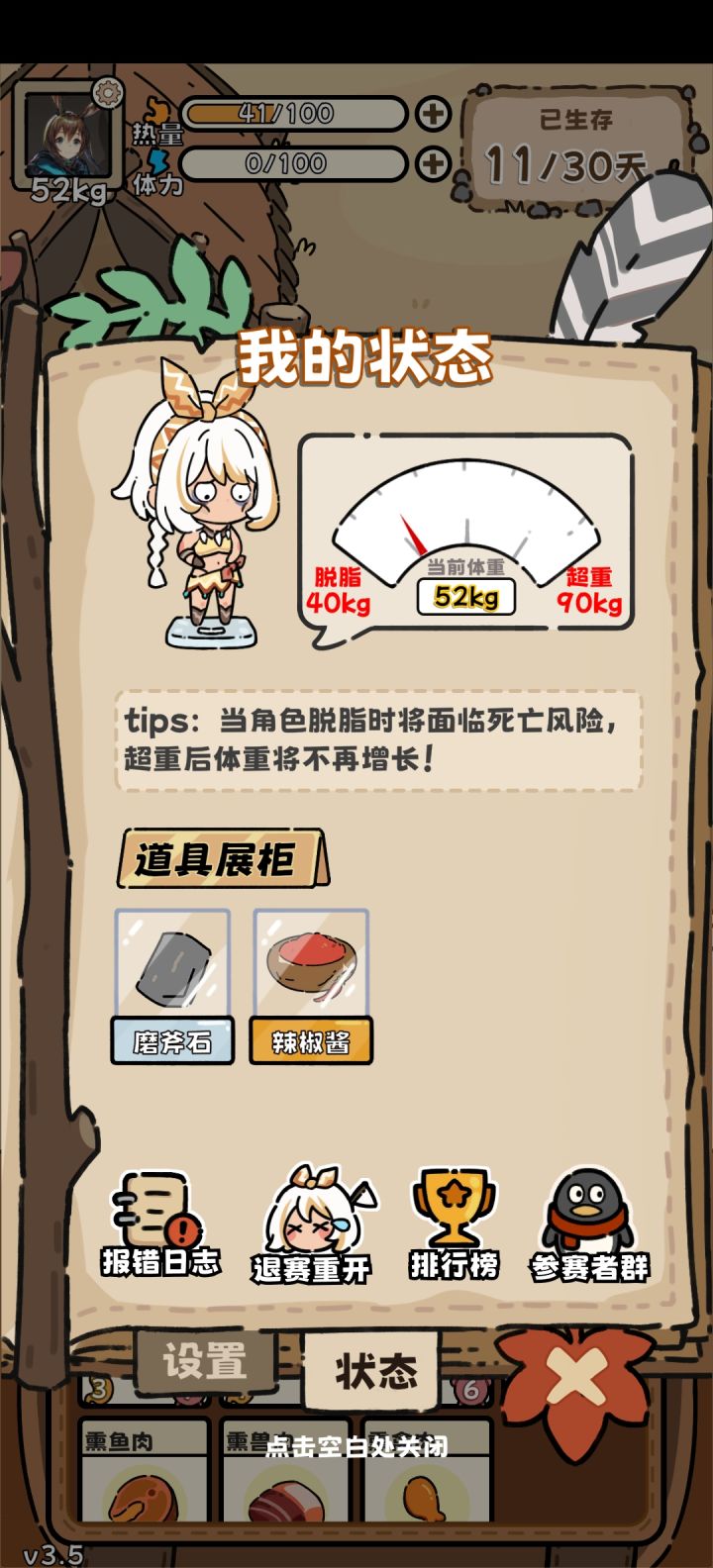 最新版本3.4目前每天地图上只会刷新四个资源。其中包括海藻,浆果,蘑菇以及所有动物,鱼类都算做一个资源点,物资不像以前那么丰富了。相对而言正常开局大型猎物出现的概率降低会比较明显。而且现在第30天必须有60热量下一天才会视为通关游戏,所以游戏难度有一定程度的提升。目前建议新人陨石开局,幸运药水也尽量拿到,游戏下来体验会轻松不少。