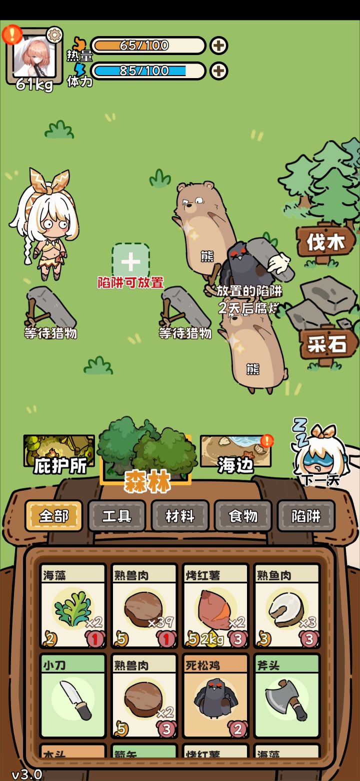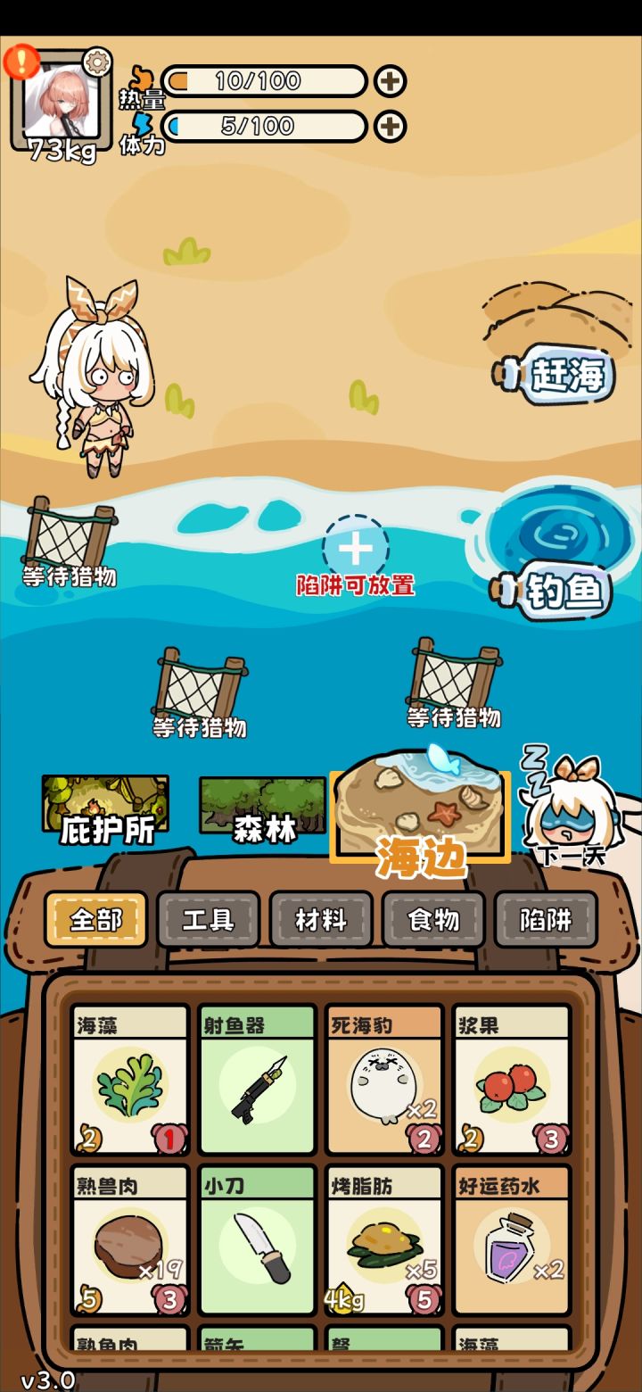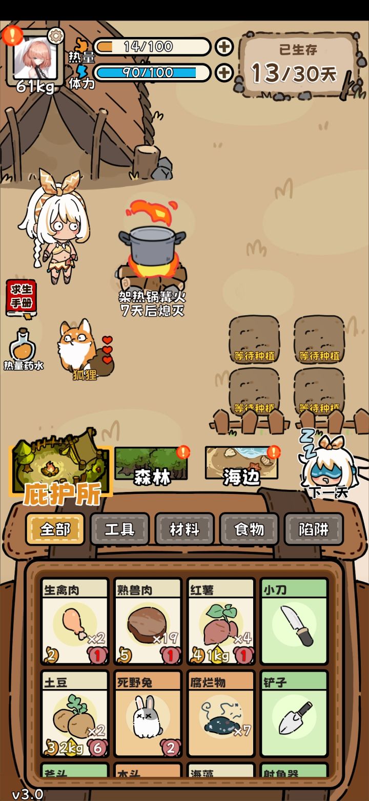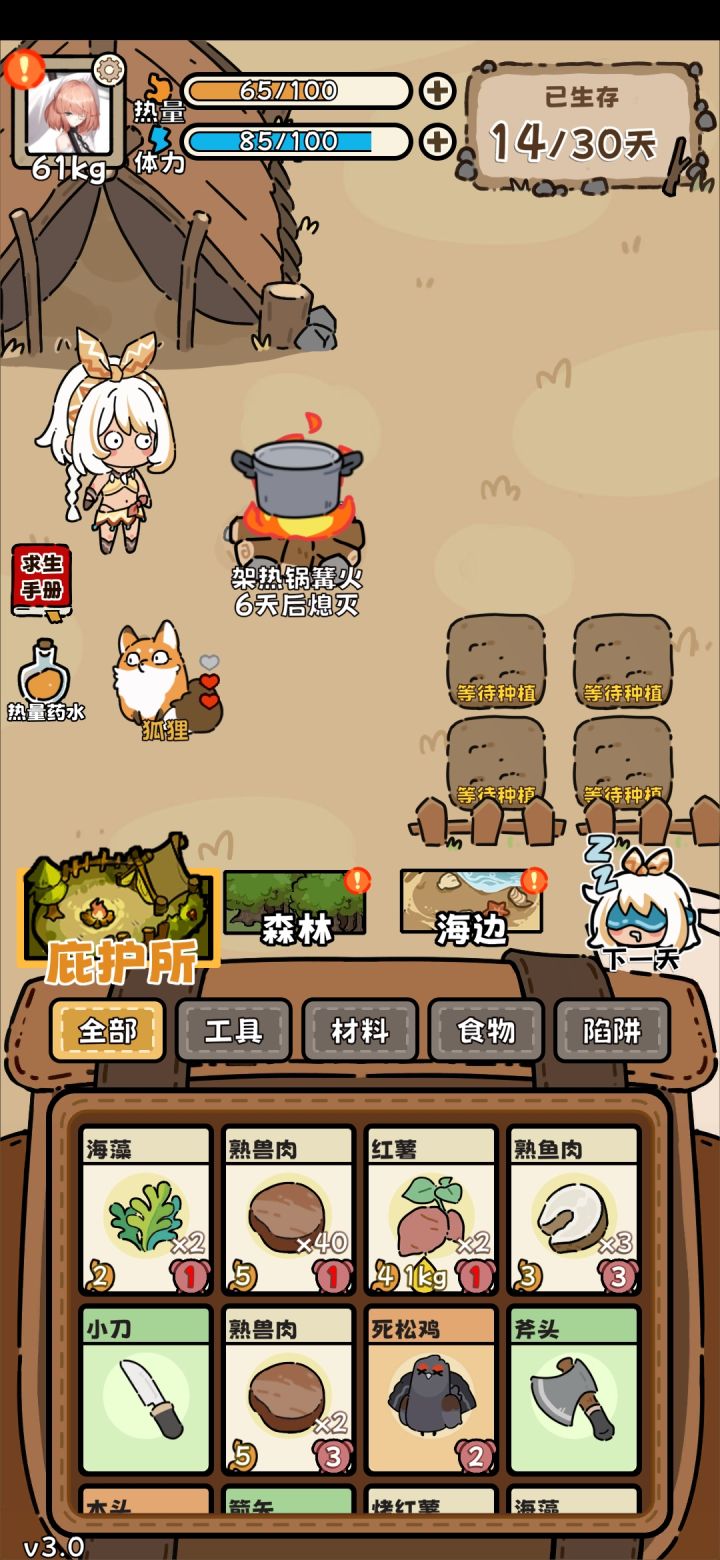1、前面捡到的海藻、蘑菇、浆果(这个如果有狐狸可以拿来喂狐狸)等能腐烂的都等他腐烂,后期没法出门了可以用腐烂物和木头合成蘑菇,这是存粮(!注意,合成蘑菇有失败几率和保质期,别一次性全合了!)2、前面最好能遇到熊把熊打了,不然前期你的热量维持不住,我这把算非的,开局给了捕鱼网一直抓不到鱼,所以最好前面能胡一点,不然打着挺费劲。3、钓鱼很亏!最好别钓(赶海摸到鱼饵了还是能钓一下的)前面多砍树,最好