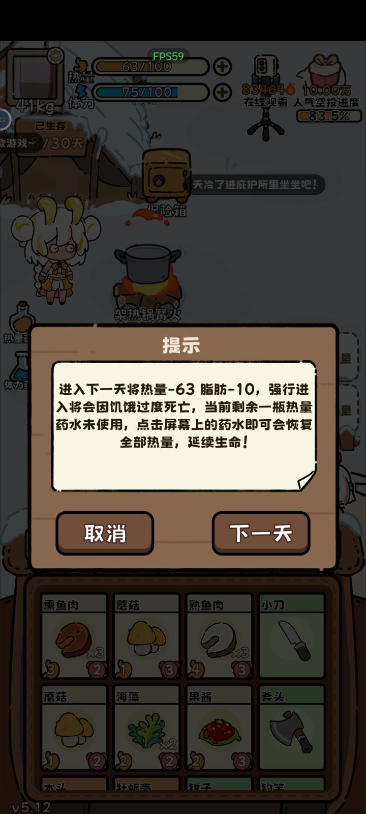 不知道为什么,我玩的时候运气是真的巨差,先不说50%概率带着吉利服第7次才中,还半天不出动物。最恐怖的是我第27天的时候冰块里出了个熊哥,接下来好几天热量能到60以上,结果还能减脂肪……这概率没问题吗?