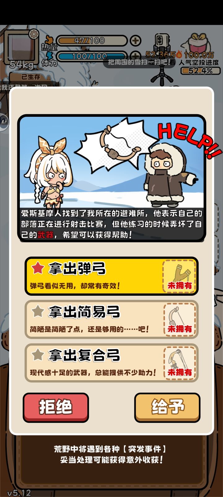 娘嘞爱斯基摩人,你一局问我三次有没有弹弓、简易弓、复合弓,你觉得我可能有吗,没有你还老问官方,修改一下可以吗,简易弓、复合弓本来就非常少见啊#荒野求生模拟器