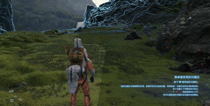 PS4手柄操作一览基本控制载具控制基础操作教学初进入游戏先熟悉最基本的基础操作。左摇杆控制走路(按下左摇杆可奔跑),右摇杆控制视角(按下右摇杆可切换视角),手柄的两个扳机键分别代表山姆的左手和右手操作。捡起货物后,按△将货物放到背上。也可以直接按△将地上的货物放到背上。山姆左肩上的仪器叫“奥卓德克扫描仪”,按R1扫描,可以查看周围地形和货物。关于地形,扫描后会出现蓝色、黄色、红色各种不
