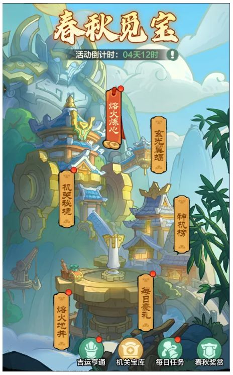 春秋觅宝神秘的机关城有什么探险等待着各位大侠呢?下面就由小虾米带领大侠来看看吧~活动时间3.12 - 3.17(3月16日结束,3月17日为道具兑换期)机关秘境机关城机关巨人,原来是机关秘境的守护者!限时之内,完成机关巨人留下的五道谜题,即可获大量[天工百窍核]、[招募令]和[加速券]。在不同谜题,机关巨人都会有不同增减益状态,大侠需根据关卡特性,围绕「鲁班」搭配阵容。当成功