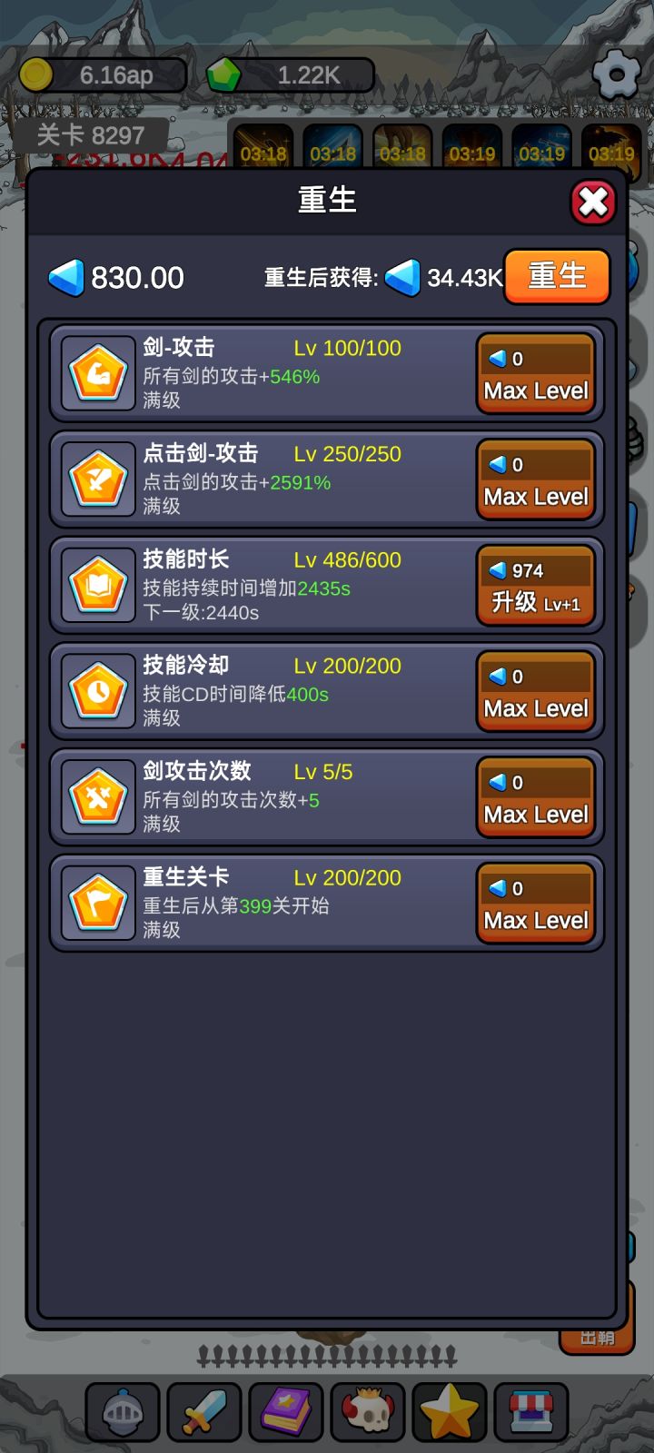#游戏讨论 作者你好,不知道你接下来还会不会更新,发现的很多问题希望能够更新修改解决一下,就完美了。第一个问题,重生里的剑攻击希望能够增加一些上限。还有重生关卡满级给的也太少了吧?才399关。后期动不动就是几万关的,这点确实不够看啊,应该搞成百分比一万关保留百分之20。两万关保留百分之三十,最高可保留百分之50也行吖第二个问题,秘籍里的钻石手册可以适当的加一点,秘籍需求钻石真的