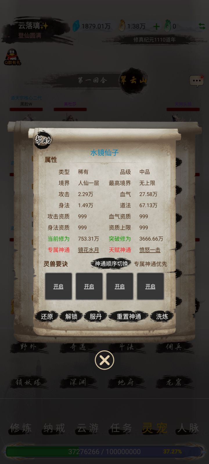 组队与灵宠浅谈 1.关于组队经验:打怪升级建议组队进行,实测组队刷怪和个人刷怪得到的经验是一样的,越多人刷,刷怪更快收益更大。 2.关于灵宠: (1) 影响成长值的因素包括:稀有程度、品级、资质。同资质(攻击、血气、身法分别最高 1000)、同品级、同等级下,稀有灵宠比普通灵宠成长值更高;(2)资质可以通过洗炼提升。资质洗炼丹可通过仙盟、买卖、活动-古邪神·螯[分身](免费)、签到(免费)