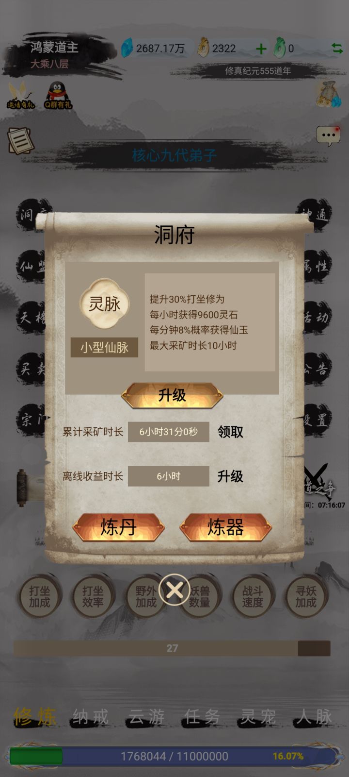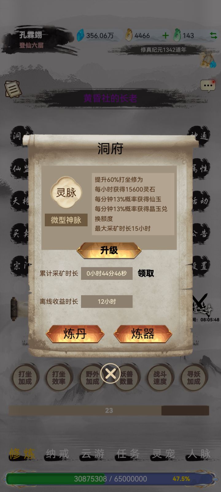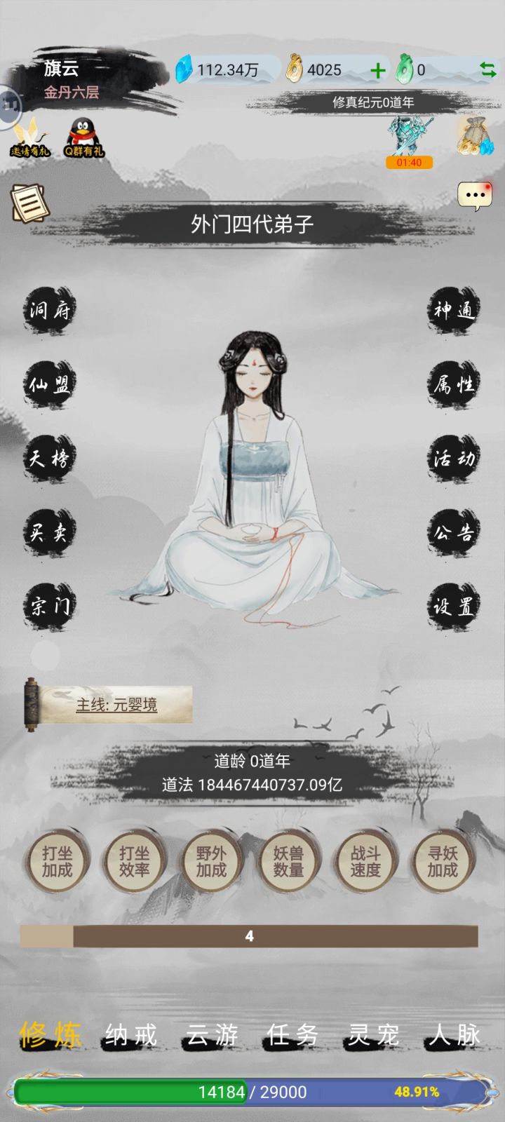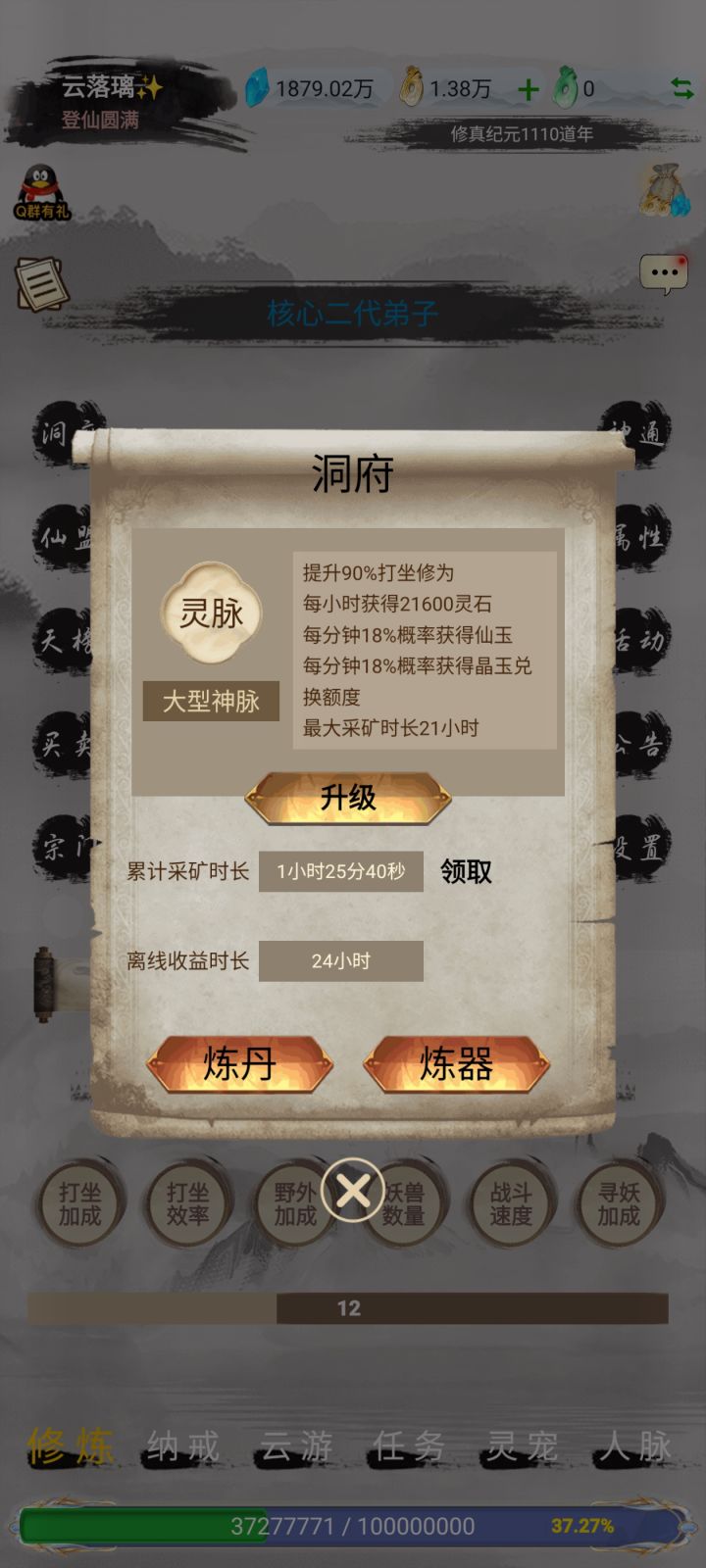 一、前期准备 1. 入门引导 ◦ 优先跟随主线推进至元婴期,尽早通过“云游-队友-固定队招募”组建固定队,刷图效率远高于 solo 野外。 ◦ 开局先领取所有兑换码,仙玉优先投入“洞府-灵脉”(优先级最高,直接提升打坐经验和灵石获取,建议拉满)。 2. 宗门选择 ◦ 道天宗:0氪/小氪首选,+10%打坐经验,开局全体+20%攻、10%身法(固定队必备buff),辅助定位。 ◦ 魔天宗: