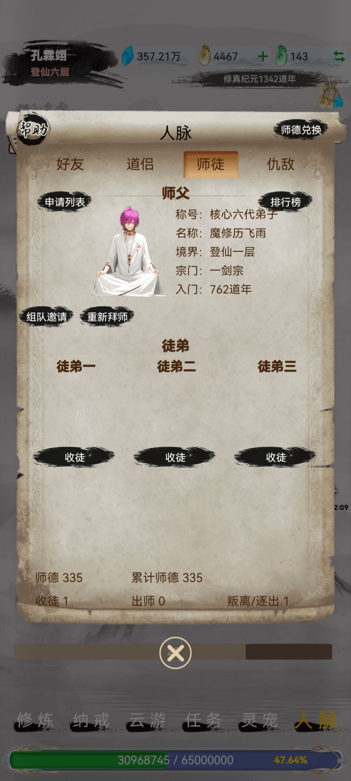 一、宗门抉择,开启修仙之路 开局加官方q群,然后查看群文件礼包码!游戏里有三个宗门: 道天 辅助 回血,给全体加20%速度和攻击,打坐经验加成10% 0氪或小氪玩家,固定队必备辅助,操作简单 一剑 主输出 自身攻击加成20%,打野快 追求高输出的玩家,前期输出强,组队受欢迎 魔天 主防御 野外挂机修为加成5%,打BOSS和PVP厉害 中氪及以上玩家,后期发力,需培养强力灵宠 新手建议先选道天宗,组
