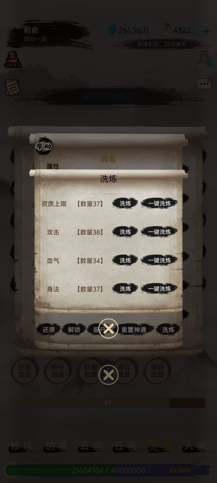 装备强化及洗练继承,本文继承方法是由世外高手大佬发布,基本上所以玩家都是用的这套继承方法 可惜大佬没玩了。 游戏内装备全部靠野外掉落(妖塔也掉落),每个境界2种装备(例,渡劫1,渡劫7),装备分为武器,鞋子,帽子,衣服,装备品质分为:白,绿,蓝,紫,金,红,红色未开放。一般都是选择金色装备使用。其他颜色直接分解。洗练:通过洗练石洗练完整度,越高越好洗练一次所需灵石相当于强化10次,较贵,洗练到