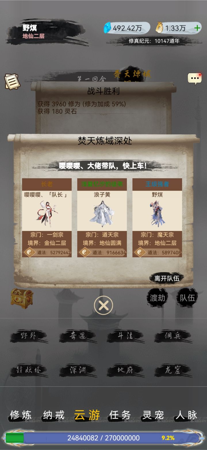 一区接引码:jOyBopYRbEZ8V4p新手建角色优先进官方群找固定队友(有兑换码,接引码)固定队很重要,能找到大佬带队最好①仙玉不要乱花,优先升级洞府其次药田(氪佬全部拉满)②有固定队组队情况下有增益丹要吃(氪佬24小时拉满增益丹)③宠物没有好的没必要培养让它出场做经验宝宝就好(仙兽最好其次最高境界无上限的)④装备前期建议强化20+不建议继承。渡劫7再强化满继承(氪佬另说)⑤法宝前
