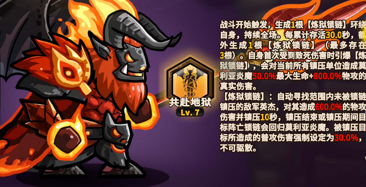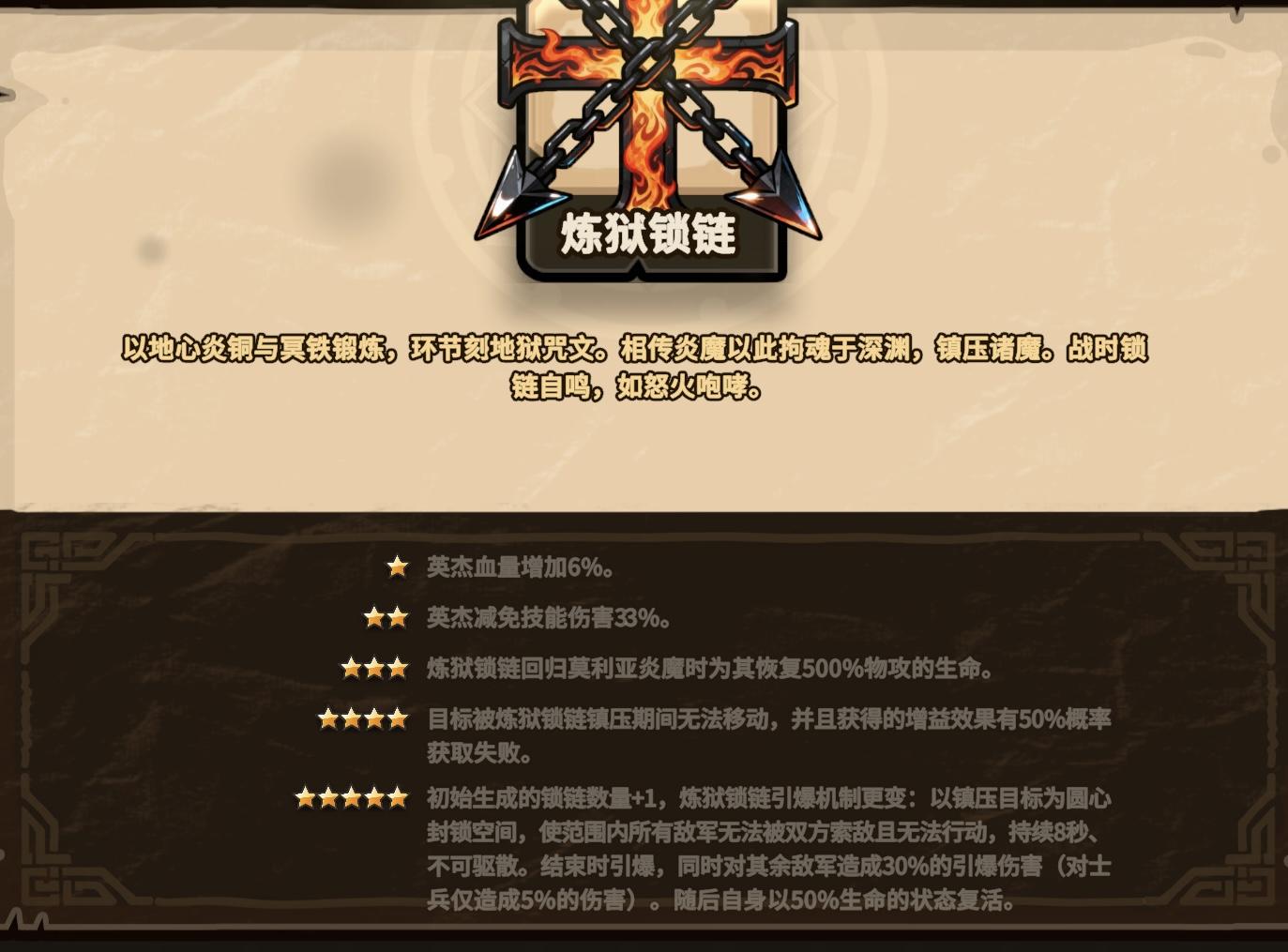 官方稀有度T0,实战强度T0,推荐抽取SS和火龙一样为大型单位,方阵没有士兵,基础属性会比同兵种英杰多20%-30%的攻击血量防御属性一、主动技能1️⃣ 战斗开始触发,生成1根【炼狱锁链】环绕自身,持续全场。每累计存活30秒,都额外生成1根炼狱锁链(最多存在3根)。【炼狱锁链】:自动寻找范围内未被锁笼镇压的敌军英杰,对其造成600%的物攻伤害井镇压10秒,镇压结束或镇压期间目标阵亡锁链会回