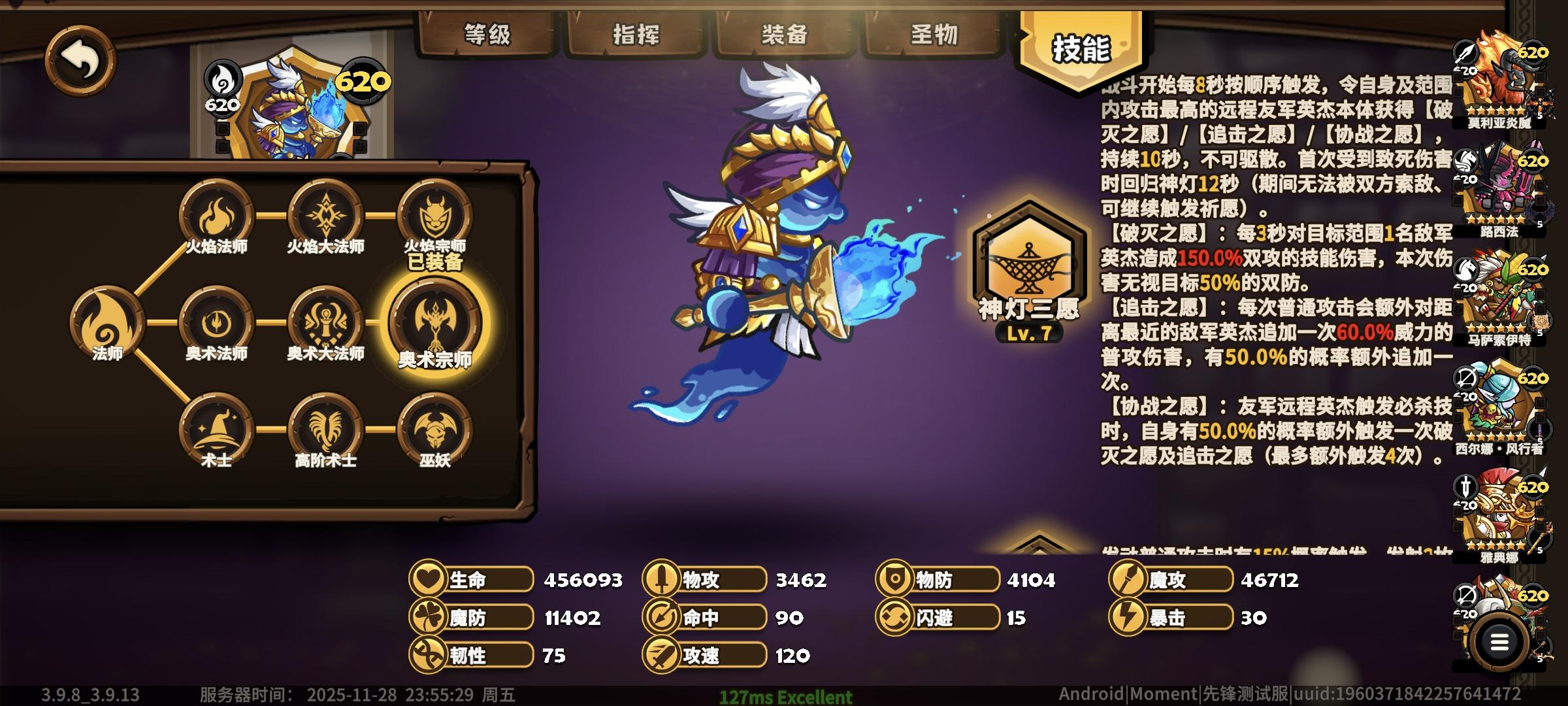 增益/输出法,弓法队辅核,稳定给c位技能型辅助带其超神。 5圣开局压一波,4圣前半分钟双倍再压一波,期间稳定辅助核心。 每8秒发动一次愿望,自身和攻击最高远程队友可以吃到,全场范围索队友,实时判定双攻总合最高的远程,目前是弓为主,后续应该会整体加法师的物攻,并非按开局面板。共三大愿望,轮续进行。【破灭】每2秒对两名敌军英杰造成250%的双攻半真伤,和索隆的戒指类似,但是戒指无视减伤和防御,