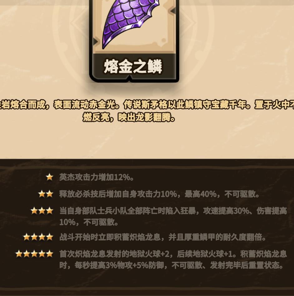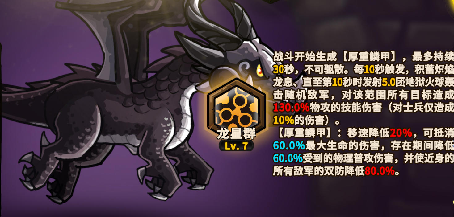 官方稀有度T0,实战强度T0,推荐抽取SSS和炎魔一样为大型单位,方阵没有士兵,基础属性会比同兵种英杰多20%-30%的攻击血量防御属性一、主动技能1️⃣ 战斗开始生成【厚重鳞甲】,最多持续30秒【厚重鳞甲】:移速降低20%-获得抵消60.0%最大生命的伤害的护盾-期间降低60.0%受到的物理普攻伤害-使近身的所有敌军的双防降低80%2️⃣ 每10秒触发,积蓄炽焰龙息、直至第10秒