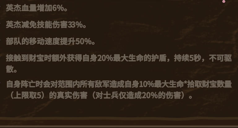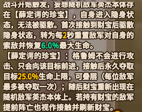官方稀有度T1,实战强度T1一、主动技能1️⃣ 标记随机英杰本体存在【薛定谔的珍宝】,自身进入隐身状态,无法被驱散。首次接触到财宝后驱散隐身状态,每2秒重置敌军对自身的索敌井恢复6%最大生命2️⃣【薛定谔的珍宝】:格鲁姆不会进行攻击、只会向该目标前进,接敌后永久夺取目标25.0%生命上限,可叠层(每位敌军最多被夺取一次):随后财宝量新出现在随机敌军英杰本体上。若持有财宝的敌军提前阵亡也视作接