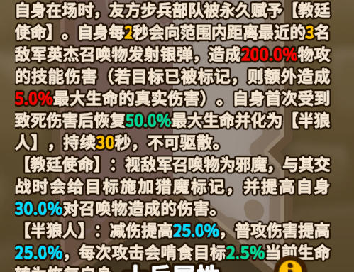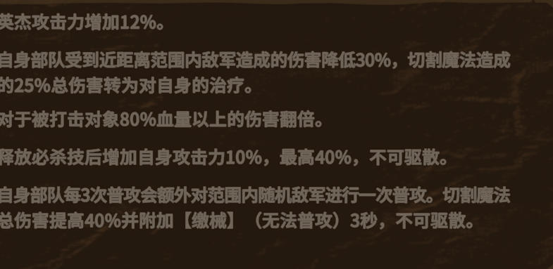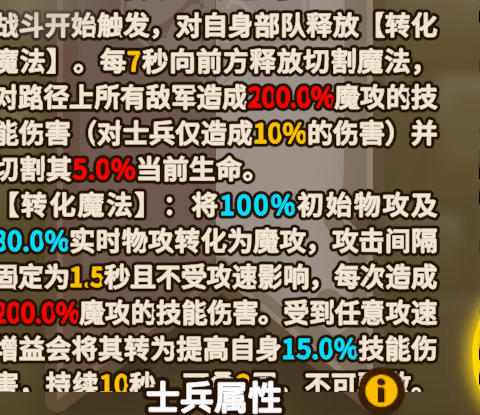 官方稀有度T0,实战强度T0,定位为近战aoe飞马一、技能技能主要分为两部分,切割魔法以及转化魔法1、切割魔法每7秒向前方释放切割魔法,路径上所有敌军造成200.0%魔攻的技能伤害(对士兵仅造成10%的伤害)并刃割其5.0%当前生命。-主要是dps伤害来源,可理解为对前方一定范围内造成aoe范围伤害,技能范围大致为前方1-2格2、转化魔法(1)转化魔法】:将100%初始物攻及30%实