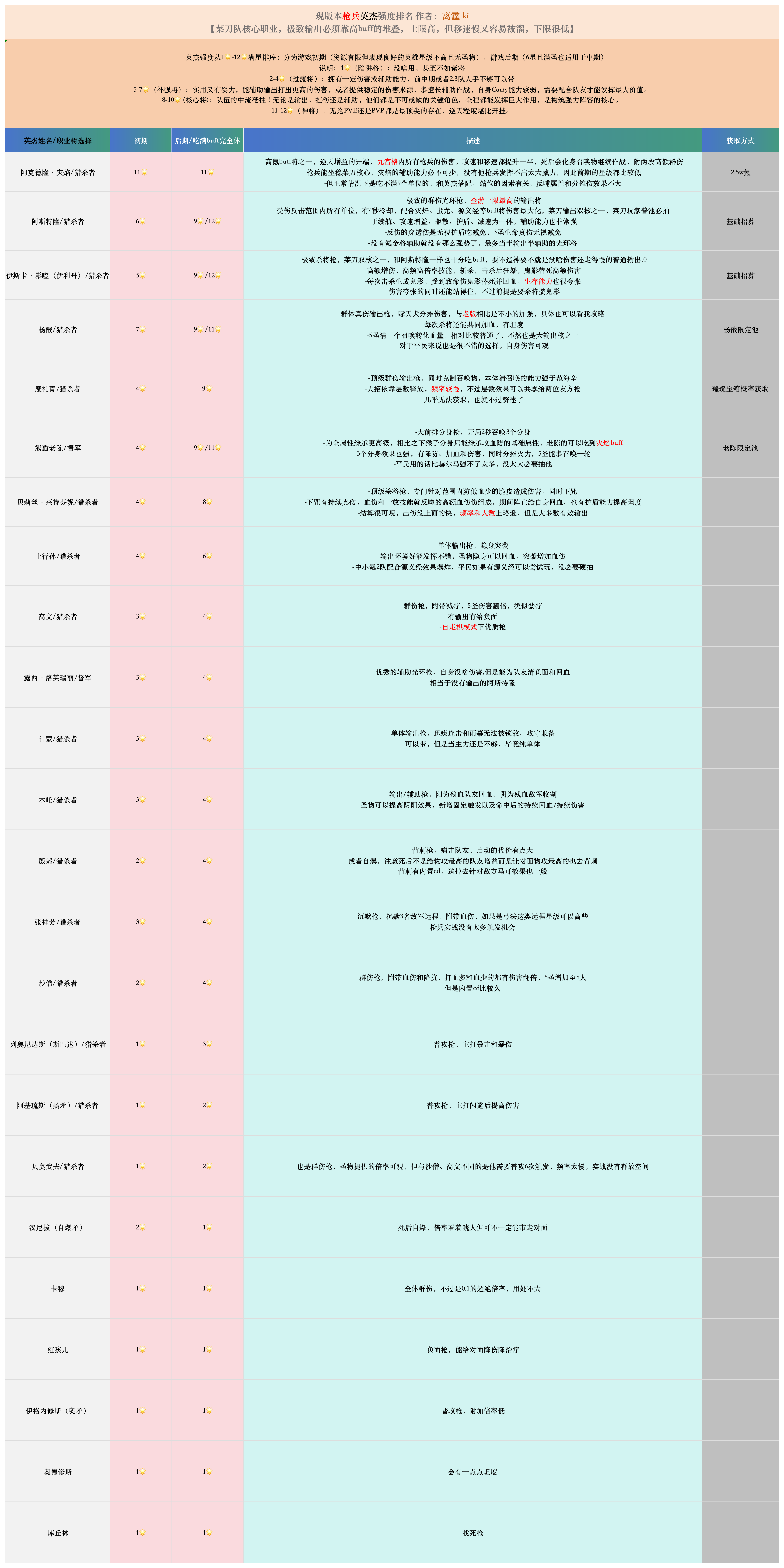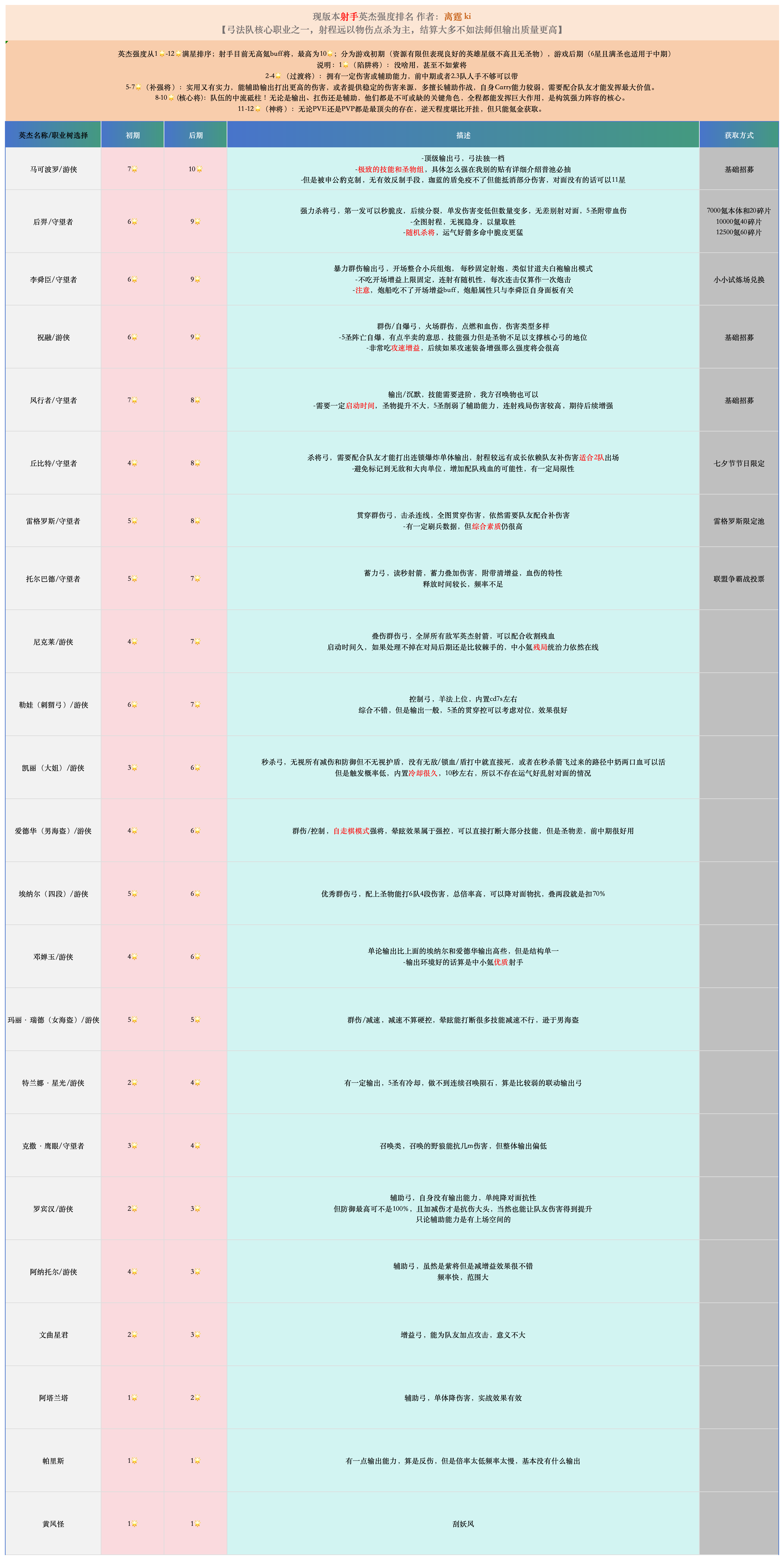 职业从左往右依次为法、弓、枪、骑、飞、战、盾、牧共8大职业。 综合评定,星级共通,包括前期后期以及高氪玩家手中同一英杰强度也有不同,相同星级也分先后,星数越多代表着上限越高强度越高,强势英杰更具体的解析可以看我相关帖子。 简单换算:10星将约为强力t0,注意不单指稀有度不同,9星普通t0,8星为t0.5强度,7星及以下为t1强度,无法担当核心,多用来补强或过渡,而低星纯是陷阱,11星t-0