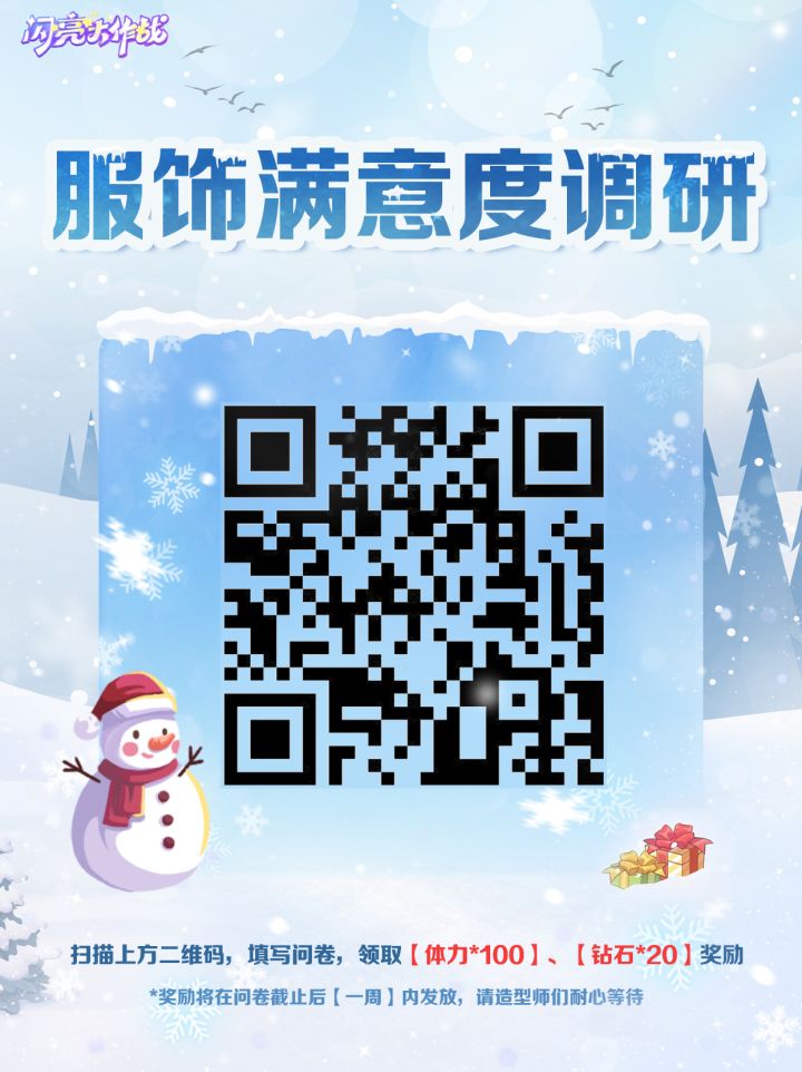 造型师们好呀!你们最爱的闪闪又来发福利啦最近服饰套装中,哪个是你的最爱?对于未来出现在节目中的服饰,您有什么期待呢?赶快来填写问卷告诉闪闪吧~扫描图中二维码,填写调研问卷,即可获得【体力*100】、【钻石*20】问卷填写截止日期:2025年1月13日23:59*问卷奖励将在问卷截止后【7】个工作日内通过游戏内邮件发放,请造型师注意査收哦#女生游戏 #合成换装就玩闪亮大作战 #休闲游戏