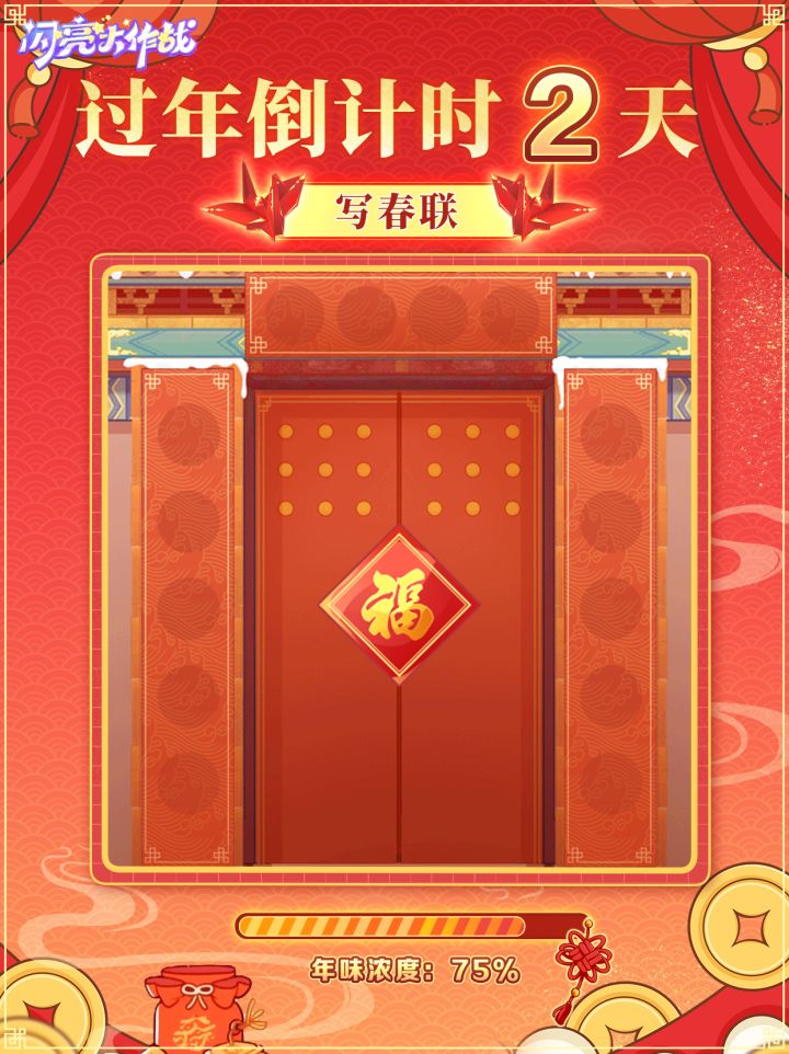 🏮年味浓度 75%🏮每逢春节,家家户户都要挑漂亮的红春联贴于门上,辞旧迎新,增加喜庆的节日气氛。咦?这里的贴春联怎么空荡荡的?造型师,我们一起挥笔写春联吧!该写什么呢?在第二张图中写春联,评论区留下你的墨宝吧!【礼包码】新年纳吉【奖励】10钻石*仅限当日使用,数量有限,先到先得!🎮 游戏名称:闪亮大作战💎 游戏平台:Android|iOS、APP|小游戏👑 游戏类型:女性向