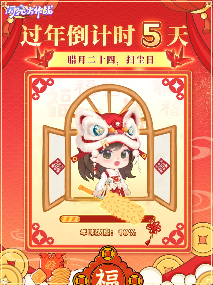 🏮年味浓度 10%🏮新年除旧岁,今日宜清洁室内,共迎新年。闪闪看着打扫一新的屋子,成就感满满呢!【礼包码】灵蛇运来【奖励】20体力*仅限1月23日使用,数量有限,先到先得!更多新春福利活动进行中:🧨新春红包封面免费发放中🧨投稿瓜分1w体力及更多惊喜好礼🧨达成话题热度里程碑,赠苍兰诀联名称号🎮 游戏名称:闪亮大作战💎 游戏平台:Android|iOS、APP|小游戏👑 游戏